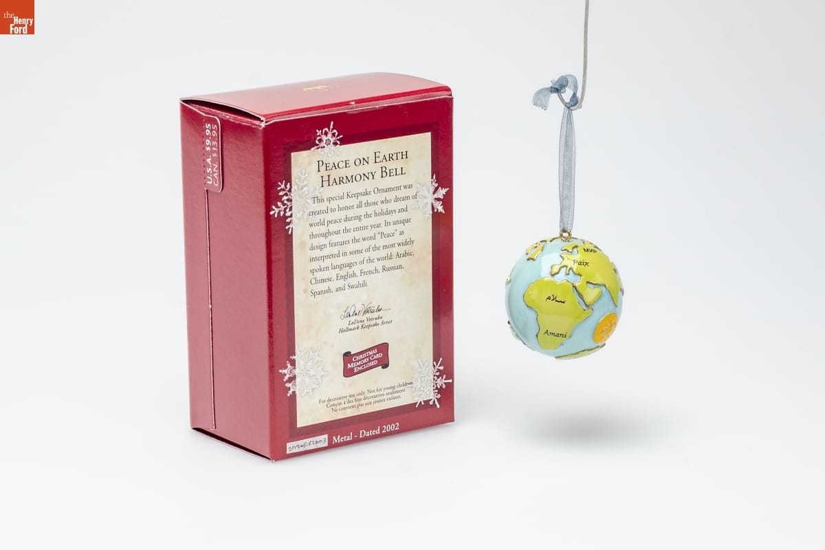PEACE ON EARTH / HARMONY BELL / This special Keepsake Ornament was / created to honor all those who dream of / world peace during the holidays and / throughout the entire year. Its unique / design features the word "Peace" as / interpreted in some of the most widely / spoken languages of the world: Arabic, / Chinese, English, French, Russian, / Spanish, and Swahili. / LaDene Votruba / Hallmark Keepsake Artist / CHRISTMAS / MEMORY CARD / ENCLOSED / For decorative use only. Not for young children. / Concue a des fins decoratives seulement. / Ne convient pas aux jeanes enfants. / Metal - Dated 2002