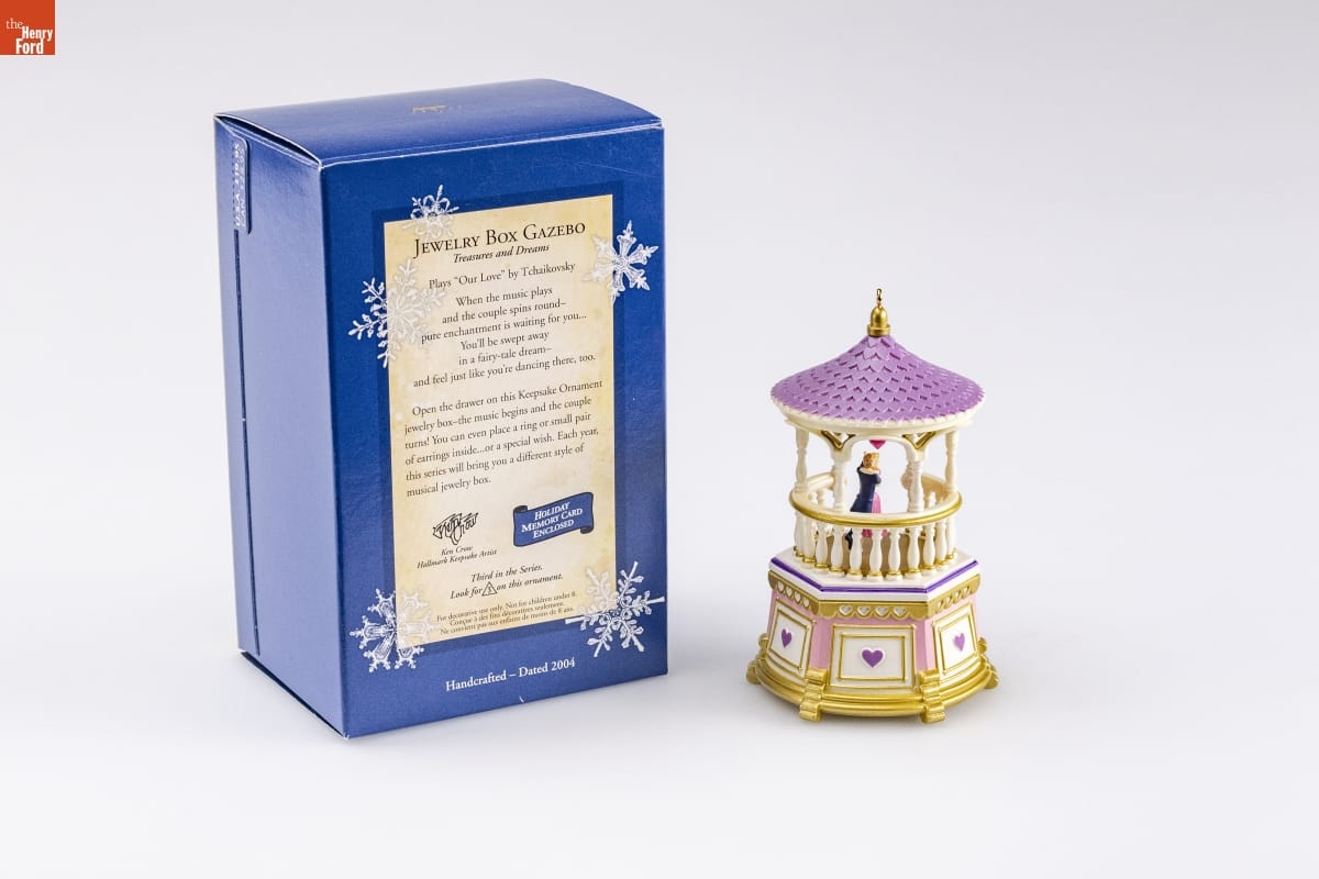 JEWELRY BOX GAZEBO / Treasures and Dreams / Plays "Our Love" by Tchaikovsky / When the music plays / and the couple spins round-- / pure enchantment is waiting for you... / You'll be swept away / in a fairy-tale dream-- / and feel just like you're dancing there, too. / Open the drawer on this Keepsake Ornament / jewelry box--the music begins and the couple / turns! You can even place a ring or small pair / of earrings inside...or a special wish. Each year, / this series will bring you a different style of / musical jewelry box. / Ken Crow / Hallmark Keepsake Artist / HOLIDAY / MEMORY CARD / ENCLOSED / Third in the Series / Look for 3 on this ornament. / For decorative use only. Not for children under 8. / Concue a des fins decoratives seulement. / Ne convient pas aux enfants de moins de 8 ans. / Handcrafted - Dated 2004