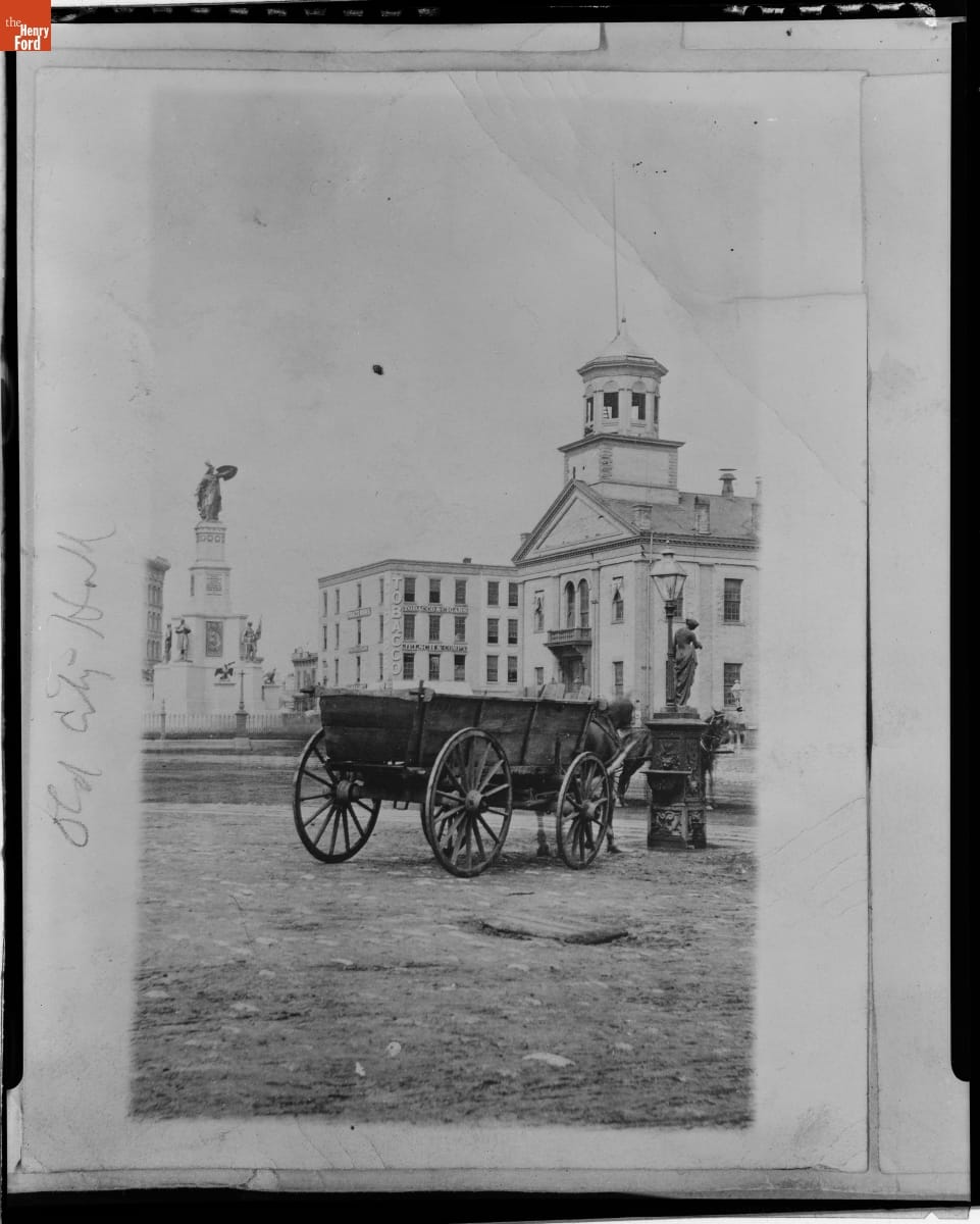 Horse-drawn Market Wagon in front of the Michigan Soldier's and Sailors' Monument and Detroit's Original City Hall Building, 1872