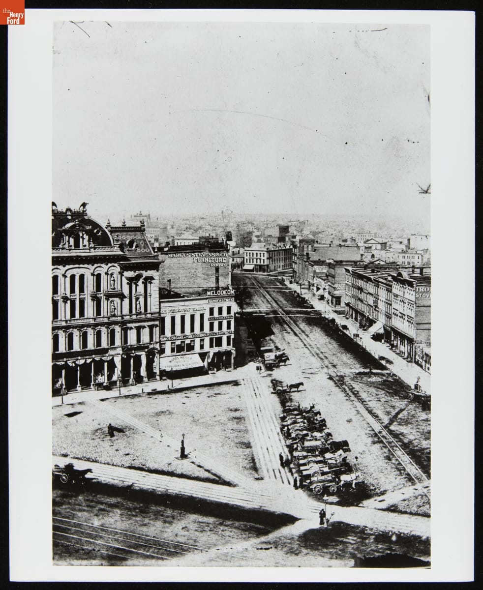 View of Campus Martius from Monroe Street, Detroit, Michigan, 1869-1879