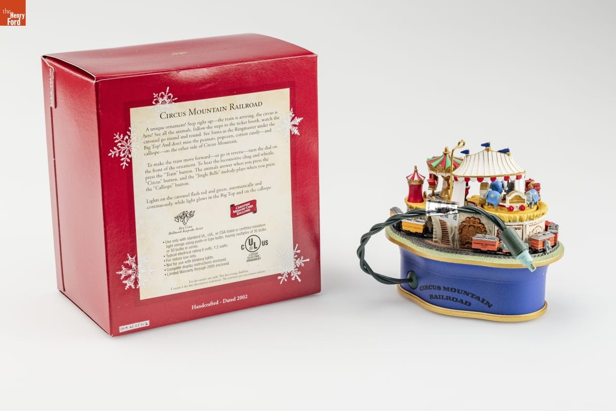 CIRCUS MOUNTAIN RAILROAD / A unique ornament! Step right up -- the train is arriving, the circus is / here! See all the animals, follow the steps to the ticket booth, watch the / carousel go round and round. See Santa as the Ringmaster under the / Big Top! And don't miss the peanuts, popcorn, cotton candy -- and / calliope -- on the other side of Circus Mountain. / To make the train move forward--or go in reverse--turn the dial on / the front of the ornament. To hear the locomotive chug and whistle, / press the "Train" button. The animals answer when you press the / "Circus" button, and the "Jingle Bells" melody plays when you press the "Calliope" button. / Lights on the carousel flash red and green, automatically and / continuously, while light glows in the Big Top and on the calliope. / Ken Crow / Hallmark Keepsake Artist / CHRISTMAS / MEMORY CARD / ENCLOSED / Use only with standard UL, cUL, or CSA listed or certified miniature / light strings using push-in type bulbs, having multiples of 35 bulbs / or 50 bulbs in series. / Typical electrical rating 6 volts, 1.2 watts. / For indoor use only. / Not for use with blinking lights. / Complete display instructions enclosed. / Limited Warranty through 2005 enclosed. / C UL (R) US / LISTED / ELECTRIC / ORNAMENT / For decorative use only. Not for young children. / Concue a des fins decoratives seulement. / Ne convient pas aux jeanes enfants. / Handcrafted - Dated 2002