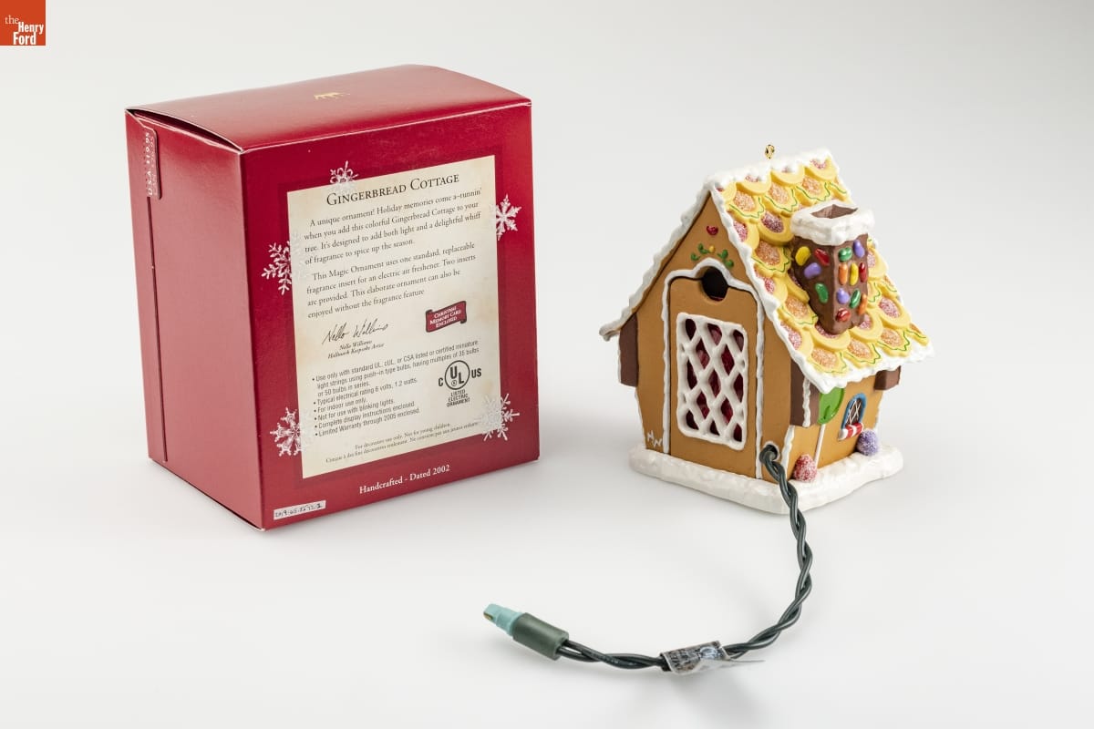 GINGERBREAD COTTAGE / A unique ornament! Holiday memories come a-runnin' / when you add this colorful Gingerbread Cottage to your / tree. It's designed to add both light and a delightful whiff / of fragrance to spice up the season. / This Magic Ornament uses one standard, replaceable fragrance insert for an electric air freshener. Two inserts / are provided. This elaborate ornament can also be / enjoyed without the fragrance feature. / Nello Williams / Hallmark Keepsake Artist / CHRISTMAS / MEMORY CARD / ENCLOSED / Use only with standard UL, cUL, or CSA listed or certified miniature / light strings using push-in type bulbs, having multiples of 35 bulbs / or 50 bulbs in series. / Typical electrical rating 6 volts, 1.2 watts. / For indoor use only. / Not for use with blinking lights. / Complete display instructions enclosed. / Limited Warranty through 2005 enclosed. / C UL (R) US / LISTED / ELECTRIC / ORNAMENT / For decorative use only. Not for young children. / Concue a des fins decoratives seulement. / Ne convient pas aux jeanes enfants. / Handcrafted - Dated 2002