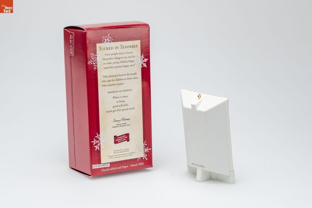 TUCKED IN TENDERLY / Some people seem to know / the perfect things to say and do / to make young children happy / (and their parents happy, too)! / This ornament honors the people / who care for children at those times / when parents cannot. / Sentiment on ornament: / When it comes / to being / good with kids, / you've got that special touch. / Tammy Haddix / Hallmark Keepsake Artist / CHRISTMAS / MEMORY CARD / ENCLOSED / For decorative use only. / Not for young children. / Concue a des fins decoratives seulement. / Ne convient pas aux jeanes enfants. / Handcrafted and Paper - Dated 2002