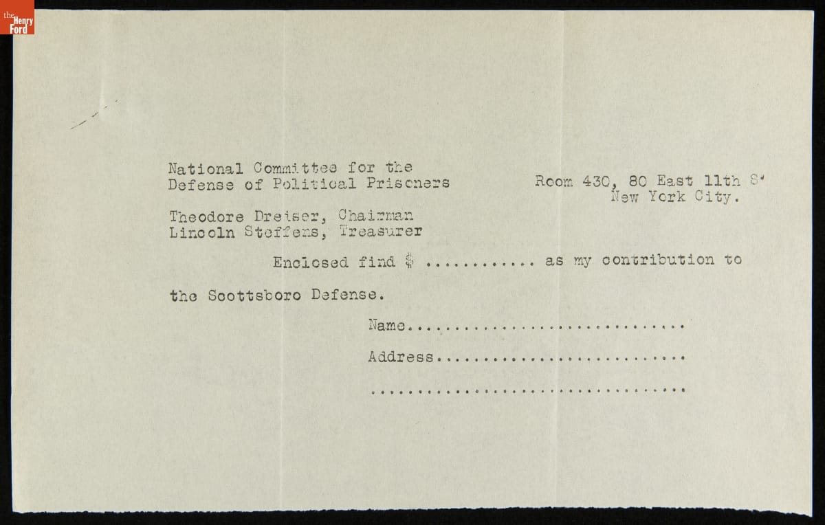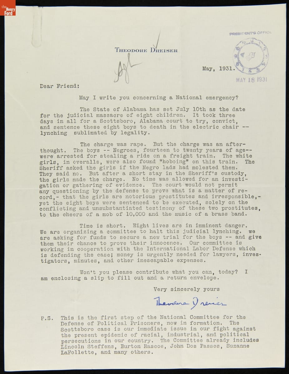 Letter from Theodore Dreiser regarding the Scottsboro Case, May 1931