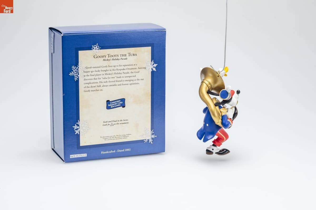 GOOFY TOOTS THE TUBA / Mickey's Holiday Parade / Good-natured Goofy lives up to his reputation as a / happy-go-lucky bungler in this Keepsake Ornament. Arriving / as the final player in Mickey's Holiday Parade, the Goof / discovers that his "tuba for two" leads to unexpected / complications. His web-footed friend is emerging as the star / of the show! Still, always amiable and forever optimistic, / Goofy marches on. / CHRISTMAS / MEMORY CARD / ENCLOSED / Sixth and Final in the Series. / Look for 6 on this ornament. / For decorative use only. Not for young children. / Concue a des fins decoratives seulement. / Ne convient pas aux jeanes enfants. / Handcrafted - Dated 2002