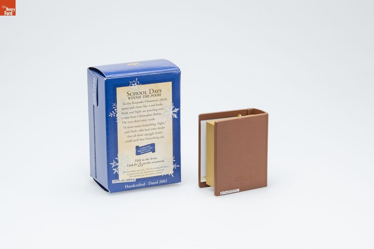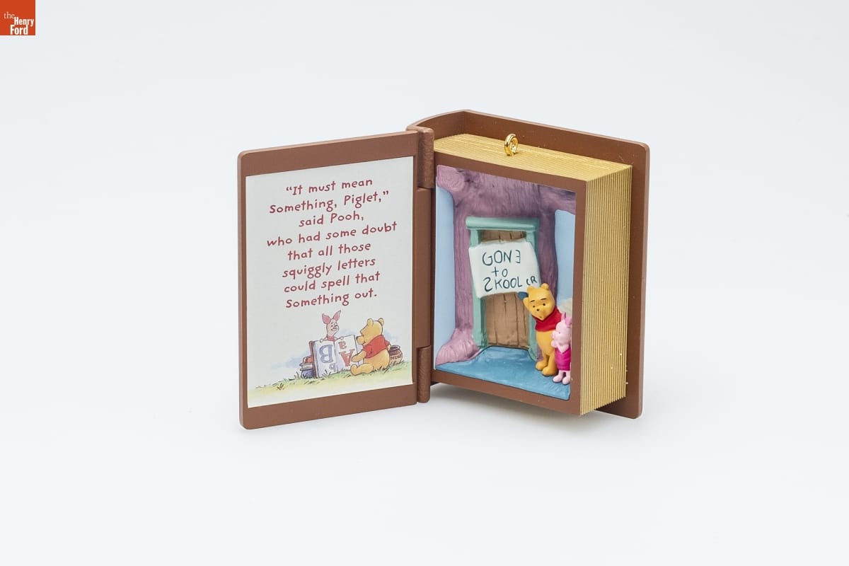 SCHOOL DAYS / WINNIE THE POOH / In this Keepsake Ornament, which / opens and closes like a real book, / Pooh and Piglet are puzzling over / a note from Christopher Robin. / The very short story reads: / It must mean Something, Piglet," / said Pooh, who had some doubt / that all those squiggly letters / could spell Something out. / CHRISTMAS / MEMORY CARD / ENCLOSED / Fifth in the Series. / Look for 5 on this ornament. / For decorative use only. Not for young children. / Concue a des fins decoratives seulement. / Ne convient pas aux jeanes enfants. / Handcrafted - Dated 2002