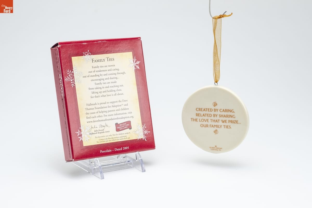 FAMILY TIES / Family ties are woven / out of tenderness and caring, / out of standing by and coming through, / encouraging and sharing... / Family ties are made / from taking in and reaching out, / lifting up and holding close, / for that's what love is all about. / Hallmark is proud to support the Dave / Thomas Foundation for Adoption [TM] and / the cause of helping parents and children / find each other. For more information, visit / www.davethomasfoundationforadoption.org. / Julie Forsyth / Hallmark Keepsake Artist / HOLIDAY / MEMORY CARD / ENCLOSED / For decorative use only. Not for children under 8. / Concu a des fins decoratives seulement. / Ne convient pas aux enfants de moins de 8 ans. / Porcelain - Dated 2005
