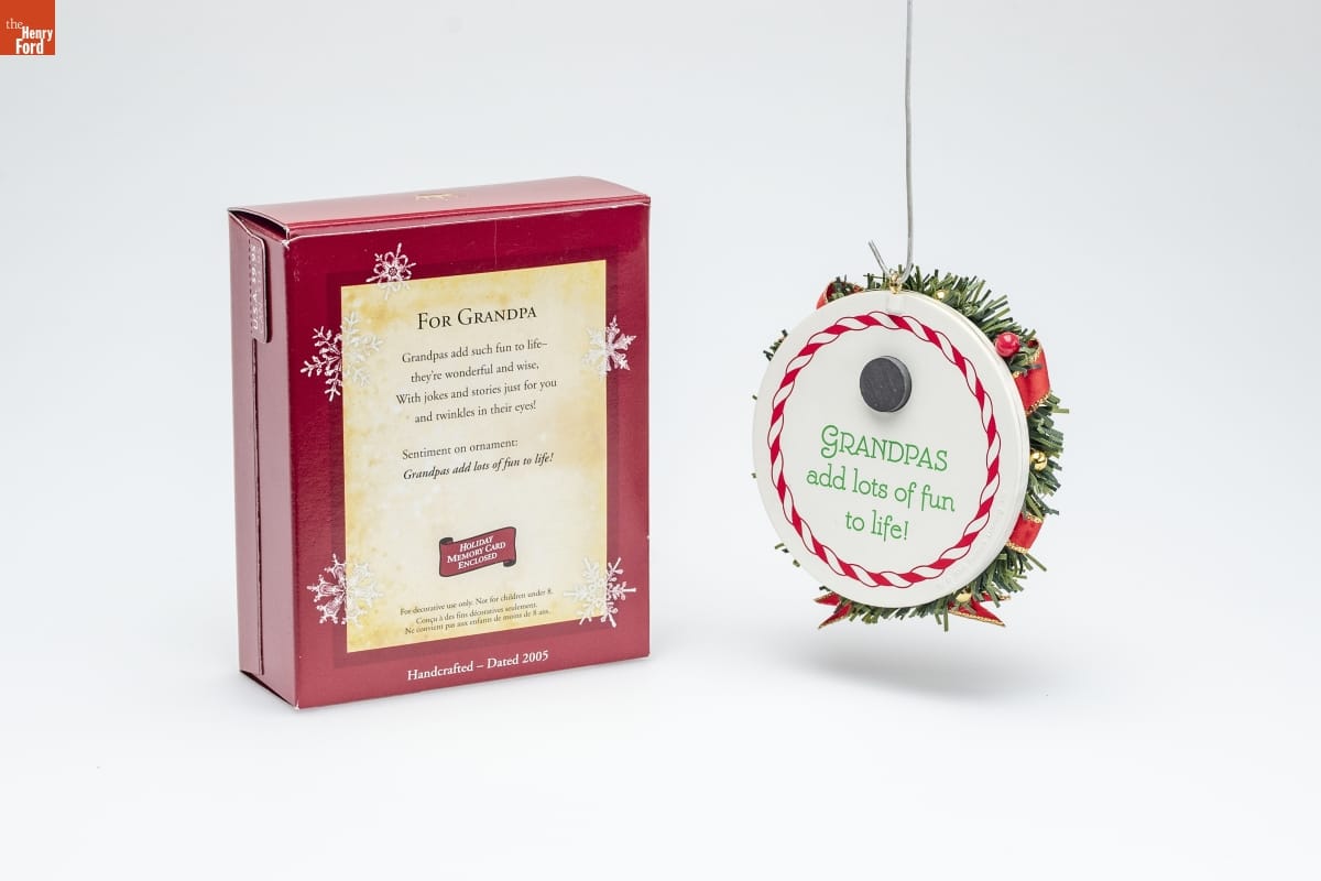 FOR GRANDPA / Grandpas add such fun to life-- / they're wonderful and wise. / With jokes and stories just for you / and twinkles in their eyes! / Sentiment on ornament: / Grandpas add lots of fun to life! / HOLIDAY / MEMORY CARD / ENCLOSED / For decorative use only. Not for children under 8. / Concu a des fins decoratives seulement. / Ne convient pas aux enfants de moins de 8 ans. / Handcrafted - Dated 2005