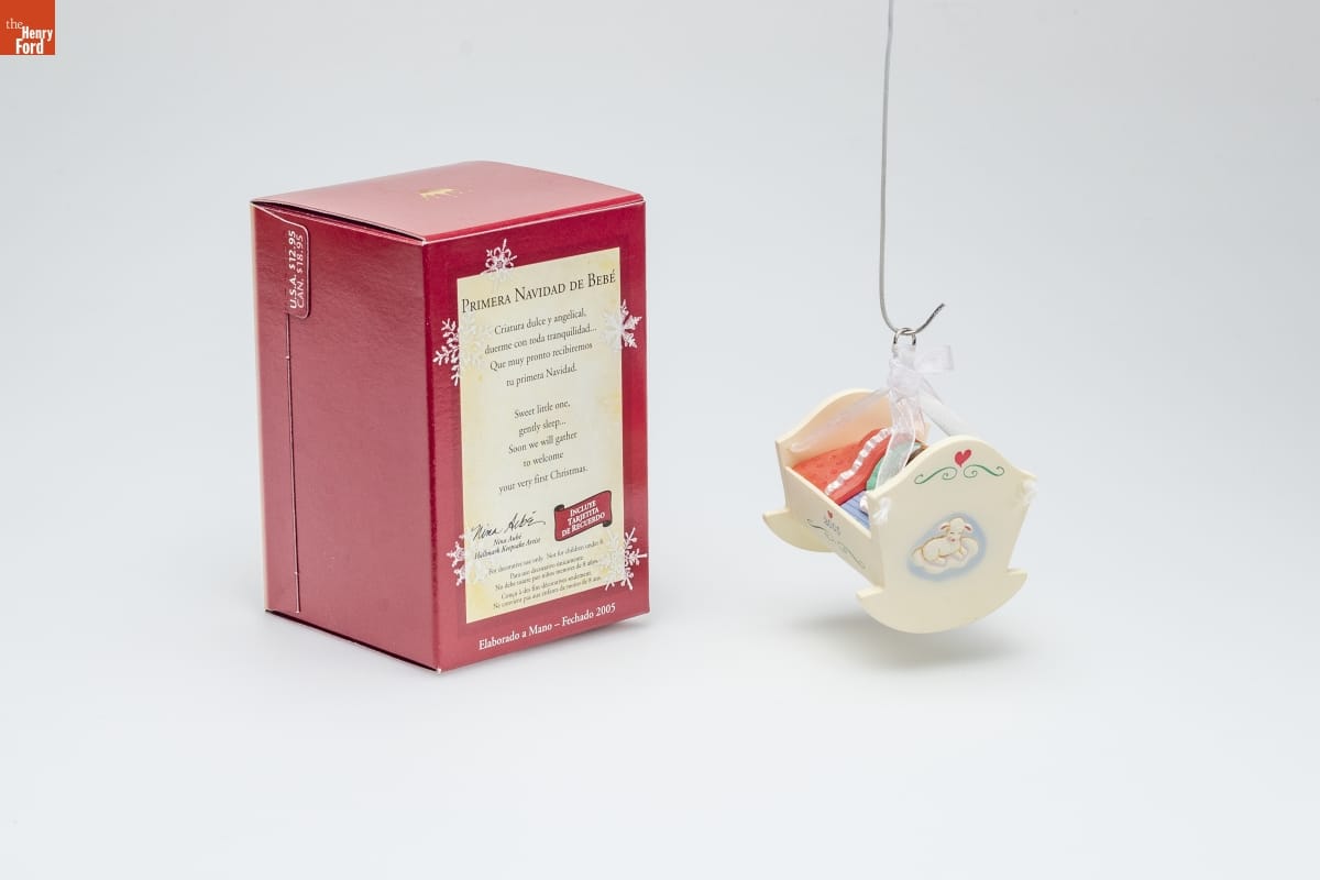 PRIMERA NAVIDAD DE BEBE / Criatura dulce y angelical, / duerme con toda tranquilidad... / Que muy pronto recibiremos / tu primera Navidad. / Sweet little one, / gently sleep... / Soon we will gather / to welcome / your very first Christmas. / Nina Aube / Hallmark Keepsake Artist / INCLUYE / TARJETITA / DE RECUERDO / For decorative use only. Not for children under 8. / Para uso decorativo uticamente. / No debe usarse por ninos menores de 8 anos. / Concu a des fins decoratives seulement. / Ne convient pas aux enfants de moins de 8 ans. / Elaborado a Mano - Fechado 2005