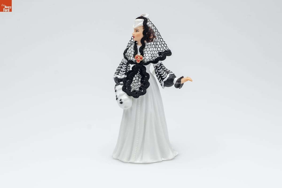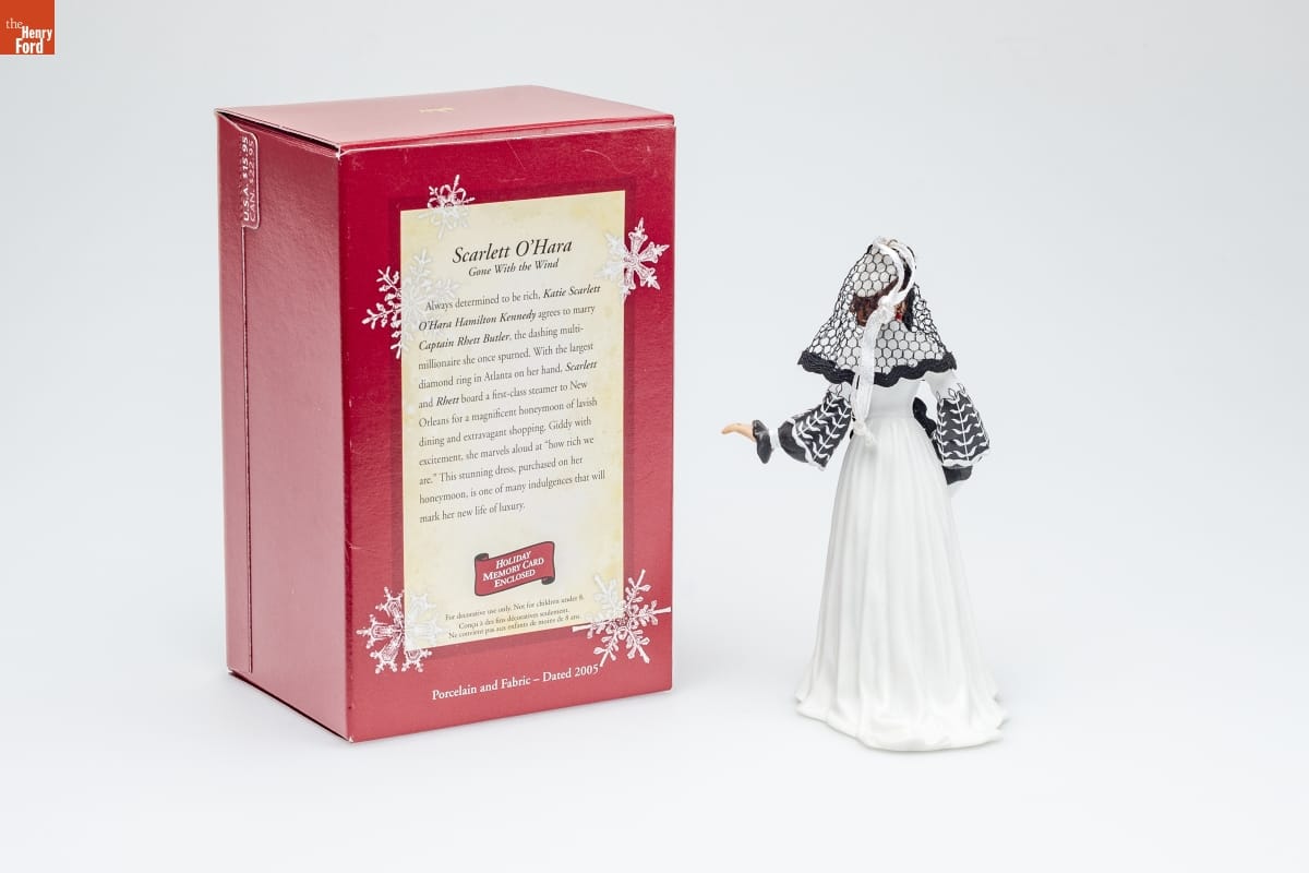 Scarlett O'Hara / Gone With the Wind / Always determined to be rich, Katie Scarlett / O'Hara Hamilton Kennedy agrees to marry / Captain Rhett Butler, the dashing multi- / millionaire she once spurned. With the largest / diamond ring in Atlanta on her hand, Scarlett / and Rhett board a first-class steamer to NEw / Orleans for a magnificent honeymoon of lavish / dining and extravagant shopping. Giddy with / excitement, she marvels aloud at "how rich we / are." This stunning dress, purchased on her / honeymoon, is one of many indulgences that will / mark her new life of luxury. / HOLIDAY / MEMORY CARD / ENCLOSED / For decorative use only. Not for children under 8. / Concu a des fins decoratives seulement. / Ne convient pas aux enfants de moins de 8 ans. / Porcelain and Fabric - Dated 2005