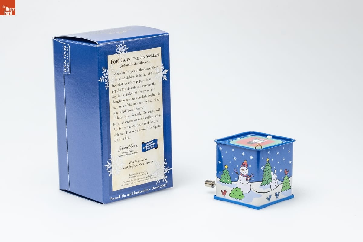 POP! GOES THE SNOWMAN / Jack-in-the-Box Memories / Victorian Era jack-in-the-boxes, which / entertained children inthe[sic] late 1800s, had / faces that resembled puppets from / popular Punch-and-Judy shows of the / day. Earlier jack-in-the-boxes are also / thought to have been similarly inspired--in / fact, some of the 16th-century playthings / were called "Punch boxes." / This series of Keepsake Ornaments will / feature characters we know and love today. / A different one will pop out of the box / each year. This jolly snowman is delighted / to be the first. / Sharon Visker / Hallmark Keepsake Artist / HOLIDAY / MEMORY CARD / ENCLOSED / First in the Series. / Look for 1 on this ornament. / For decorative use only. / Not for children under 8. / Concue a des fins decoratives seulement. / Ne convient pas aux enfants de moins de 8 ans. / Pressed Tin and Handcrafted - Dated 2003