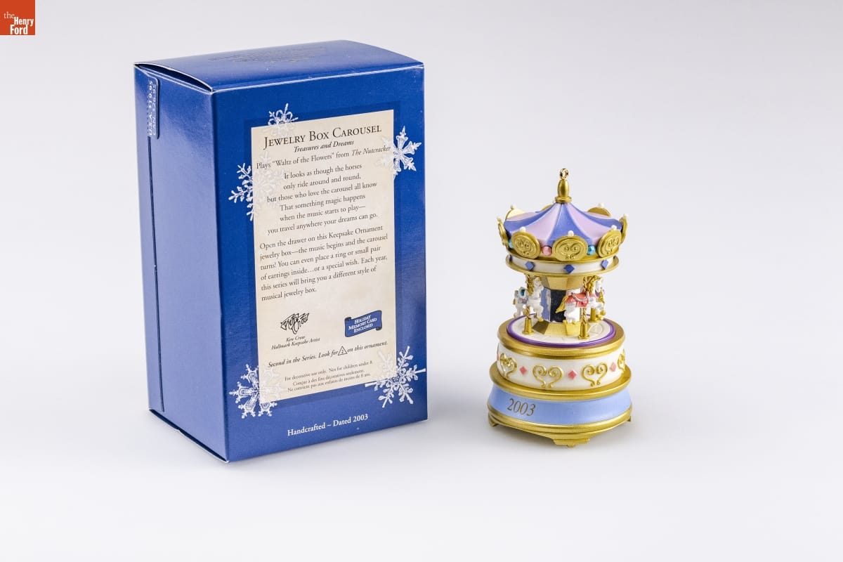 JEWELRY BOX CAROUSEL / Tresasures and Dreams / Plays "Waltz of the Flowers" from The Nutcracker / It looks as though the horses / only ride around and round, / but those who love the carousel all know / That something magic happens / when the music starts to play-- / you travel anywhere your dreams can go. / Open the drawer on this Keepsake Ornament / jewelry box--the music begins and the carousel / turns! You can even place a ring or small pair / of earrings inside...or a special wish. Each year, / this series will bring you a different style of / musical jewelry box. / Ken Crow / Hallmark Keepsake Artist / HOLIDAY / MEMORY CARD / ENCLOSED / Second in the Series. Look for 2 on this ornament. / For decorative use only. Not for children under 8. / Concue a des fins decoratives seulement. / Ne convient pas aux enfants de moins de 8 ans. / Handcrafted - Dated 2003