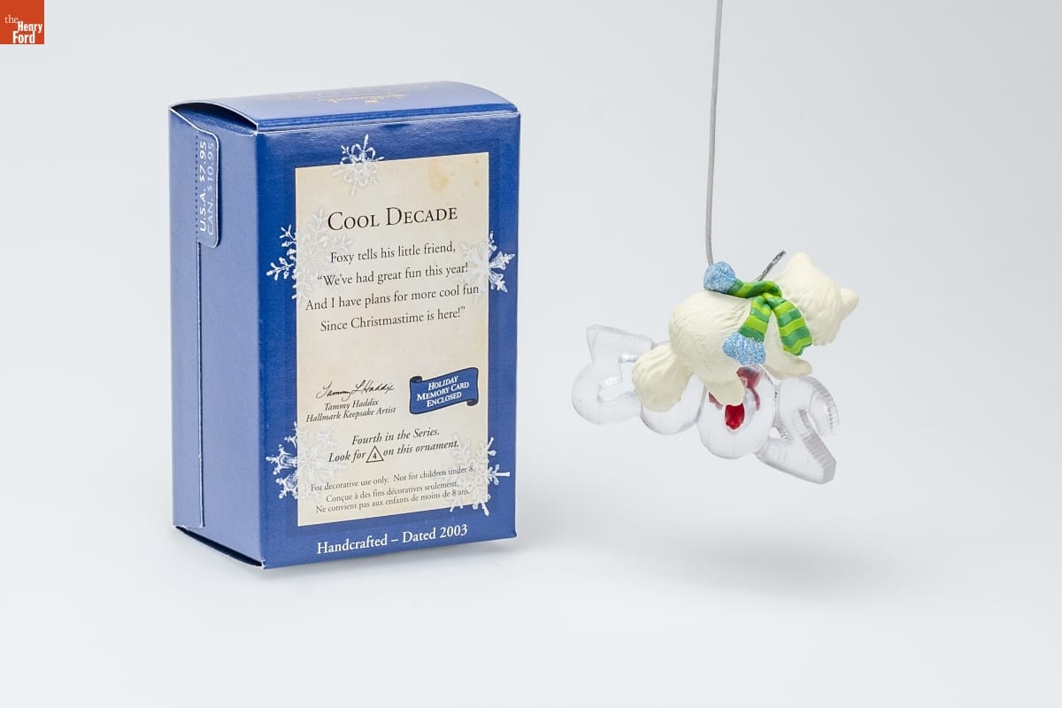 COOL DECADE / Foxy tells his little friend, / "We've had great fun this year! / And I have plans for more cool fun / Since Christmastime is here!" / Tammy Haddix / Hallmark Keepsake Artist / HOLIDAY / MEMORY CARD / ENCLOSED / Fourth in the Series. / Look for 4 on this ornament. / For decorative use only. Not for children under 8. / Concue a des fins decoratives seulement. / Ne convient pas aux enfants de moins de 8 ans. / Handcrafted - Dated 2003