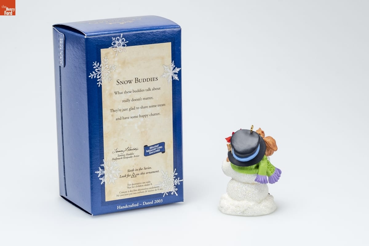 SNOW BUDDIES / What these buddies talk about / really doesn't matter, / They're just glad to share some treats / and have some happy chatter. / Tammy Haddix / Hallmark Keepsake Artist / HOLIDAY / MEMORY CARD / ENCLOSED / Sixth in the Series. / Look for 6 on this ornament. / For decorative use only. / Not for children under 8. / Concue a des fins decoratives seulement. / Ne convient pas aux enfants de moins de 8 ans. / Handcrafted - Dated 2003