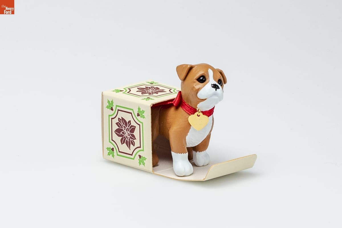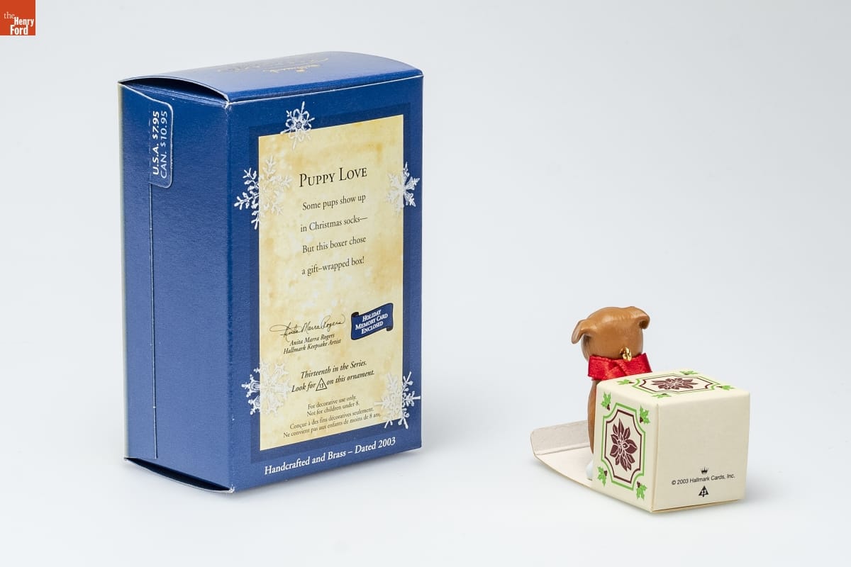 PUPPY LOVE / Some pups show up / in Christmas socks-- / But this boxer chose / a gift-wrapped box! / Anita Marra Rogers / Hallmark Keepsake Artist / HOLIDAY / MEMORY CARD / ENCLOSED / Thirteenth in the Series. / Look for 13 on this ornament. / For decorative use only. / Not for children under 8. / Concue a des fins decoratives seulement. / Ne convient pas aux enfants de moins de 8 ans. / Handcrafted and Brass - Dated 2003