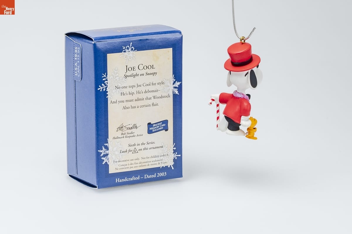 JOE COOL / Spotlight on Snoopy / No one tops Joe Cool for style. / He's hip. He's debonair-- / And you must admit that Woodstock / Also has a certain flair. / Bob Siedler / Hallmark Keepsake Artist / HOLIDAY / MEMORY CARD / ENCLOSED / Sixth in the Series. / Look for 6 on this ornament. / For decorative use only. Not for children under 8. / Concue a des fins decoratives seulement. / Ne convient pas aux enfants de moins de 8 ans. / Handcrafted - Dated 2003