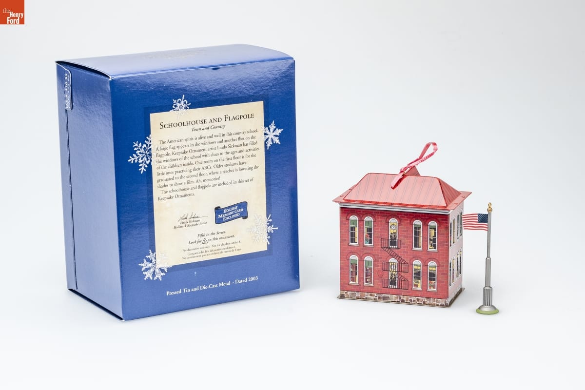SCHOOLHOUSE AND FLAGPOLE / Town and Country / The American spirit is alive and well in this country school. / A large flag appears in the windows and another flies on the / flagpole. Keepsake Ornament artist Linda Sickman has filled / the windows of the school with clues to the ages and activities / of the children inside. One room on the first floor is for the / little ones practicing their ABCs. Older students have / graduated to the second floor, where a teacher is lowering the / shades to show a film. Ah, memories! / The schoolhouse and flagpole are included in this set of / Keepsake Ornaments. / Linda Sickman / Hallmark Keepsake Artist / HOLIDAY / MEMORY CARD / ENCLOSED / Fifth in the Series. / Look for 5 on this ornament. / For decorative use only. Not for children under 8. / Concues a des fins decoratives seulement. / Ne conviennent pas aux enfants de moins de 8 ans. / Pressed Tin and Die-Cast Metal - Dated 2003