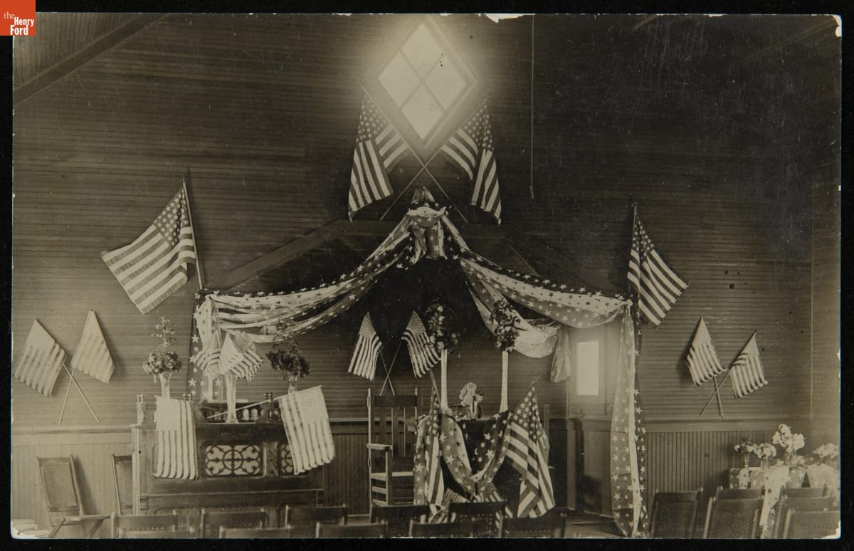 Beginning in 1868, May 30 was adopted as "Decoration Day," a time to honor the Civil War dead by decorating their graves with flowers. Over the years, Americans gathered at churches, fraternal organization halls, and cemeteries to observe the holiday--today, better known as Memorial Day. This postcard from 1910 shows a church in White Bluffs, Washington, decorated for the holiday.