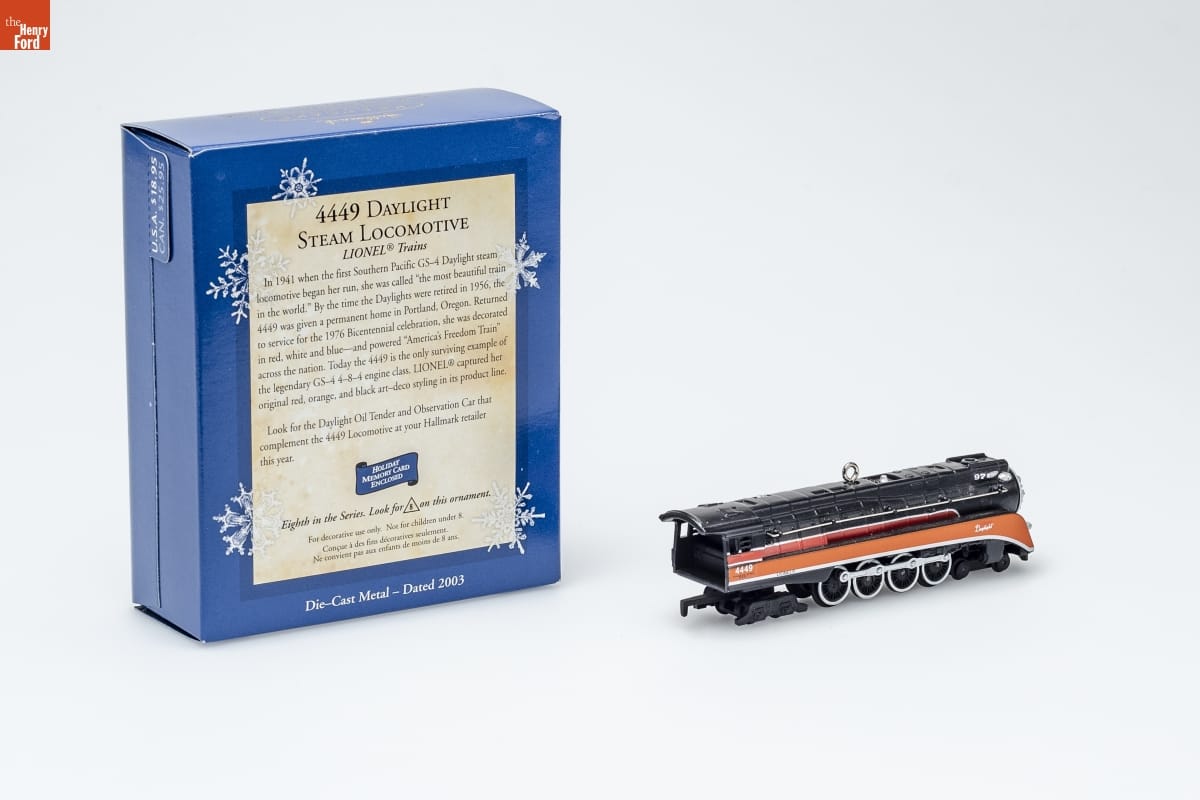 4449 DAYLIGHT / STEAM LOCOMOTIVE / LIONEL(R) Trains / In 1941 when the first Southern Pacific GS-4 Daylight steam / locomotive began her run, she was called "the most beautiful train / in the world." By the time the Daylights were retired in 1956, the / 4449 was given a permanent home in Portland, Oregon. Returned / to service for the 1976 Bicentennial celebration, she was decorated / in red, white and blue--and powered "America's Freedom Train" / across the nation. Today the 4449 is the only surviving example of / the legendary GS-4 4-8-4 engine class. LIONEL(R) captured her / original red, orange, and black art-deco styling in its product line. / Look for the Daylight Oil Tender and Observation Car that / complement the 4449 Locomotive at your Hallmark retailer / this year. / HOLIDAY / MEMORY CARD / ENCLOSED / Eighth in the Series. Look for 8 on this ornament. / For decorative use only. Not for children under 8. / Concue a des fins decoratives seulement. / Ne convient pas aux enfants de moins de 8 ans. / Die-Craft Metal - Dated 2003