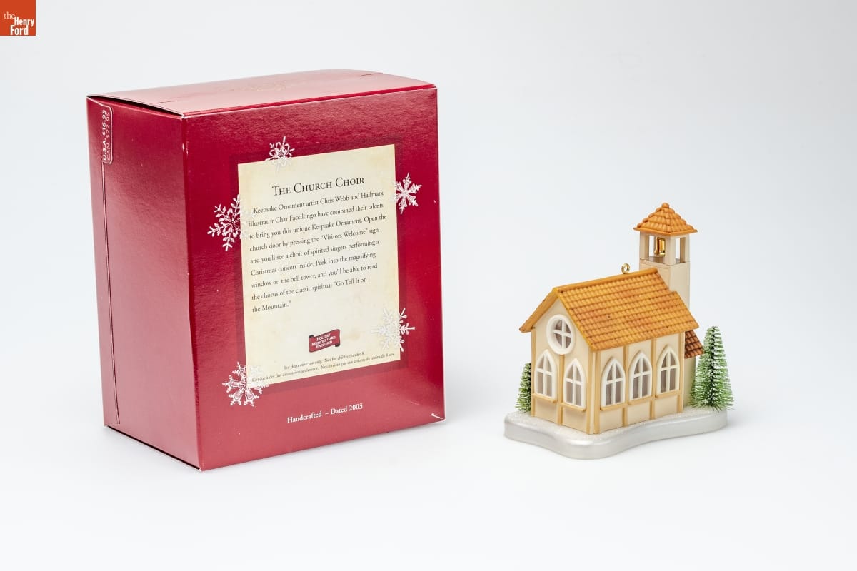 THE CHURCH CHOIR / Keepsake Ornament artist Chris Webb and Hallmark / illustrator Char Faccilongo have combined their talents / to bring you this unique Keepsake Ornament. Open the / church door by pressing the "Visitors Welcome" sign / and you'll see a choir of spirited singers performing a / Christmas concert inside. Peek into the magnifying / window on the bell tower, and you'll be able to read / the chorus of the classic spiritual "Go Tell It on / the Mountain." / Hallmark Keepsake Artist / HOLIDAY / MEMORY CARD / ENCLOSED / For decorative use only. Not for children under 8. / Concue a des fins decoratives seulement. / Ne convient pas aux enfants de moins de 8 ans. / Handcrafted - Dated 2003