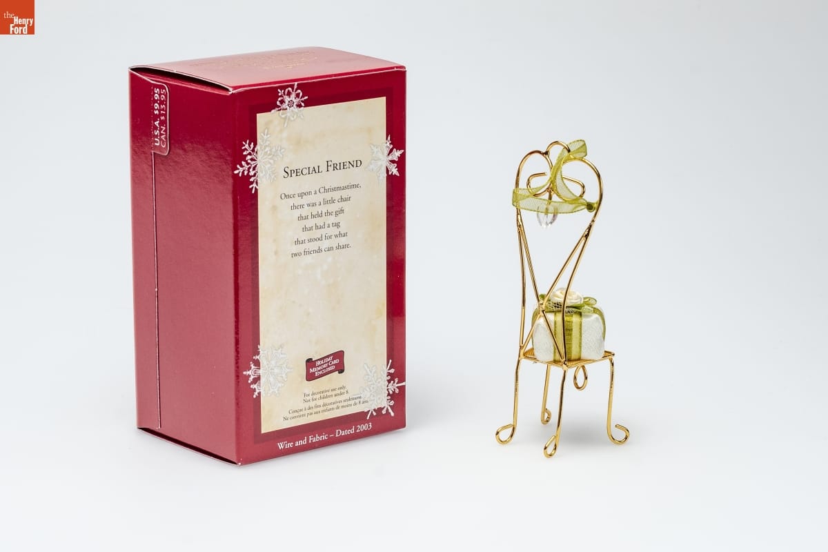 SPECIAL FRIEND / Once upon a Christmastime, / there was a little chair / that held the gift / that had a tag / that stood for what / two friends can share. / HOLIDAY / MEMORY CARD / ENCLOSED / For decorative use only. / Not for children under 8. / Concue a des fins decoratives seulement. / Ne convient pas aux enfants de moins de 8 ans. / Wire and Fabric - Dated 2003