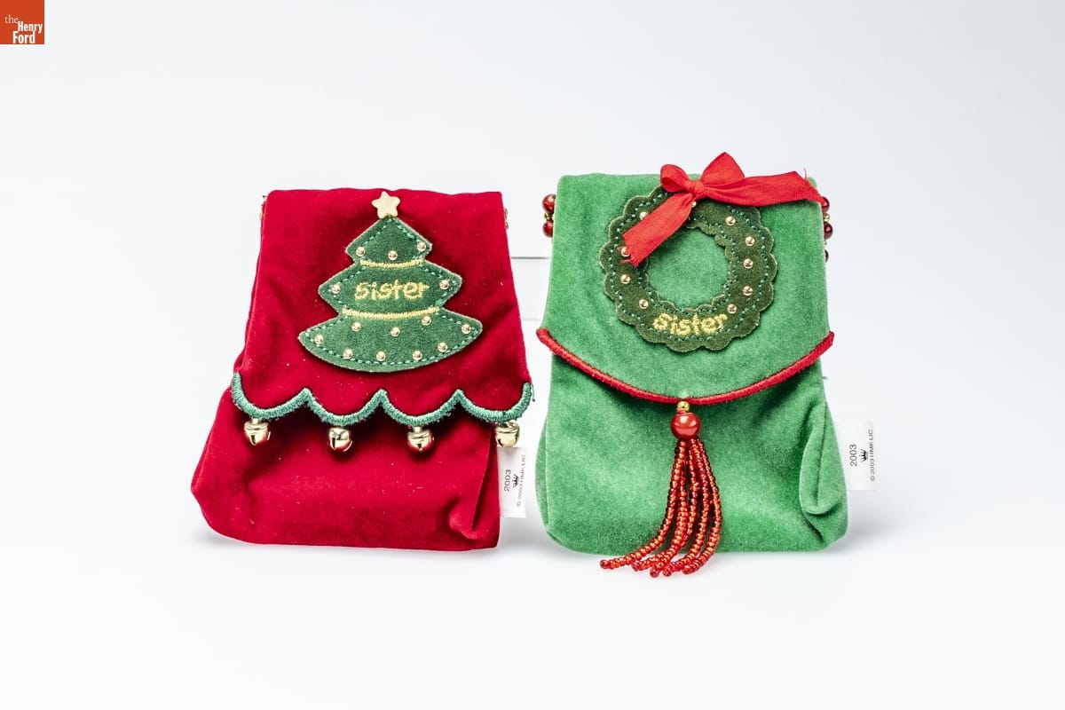 Fabric and Beads / Dated 2003 / Ruth Donikowski / Hallmark Artist / HOLIDAY / MEMORY CARD / ENCLOSED / Sister-to-Sister / Ornament / A sister is loved / for many things... / for friendship, / most of all. / For decorative use only. / Not for children under 8. / Concue a des fins decoratives seulement. / Ne convient pas aux enfants de moins de 8 ans. / (C) 2003 Hallmark Licensing, Inc. / Mfd. for Hallmark Cards, Inc., Kansas City, MO 64141 / Made in China QXG8969