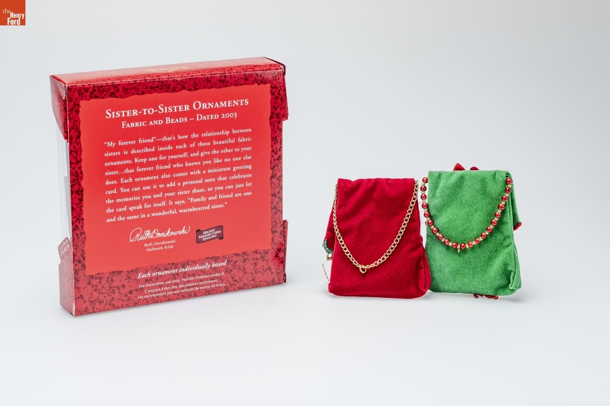 SISTER-TO-SISTER ORNAMENTS / FABRIC AND BEADS - DATED 2003 / "My forever friend" --that's how the relationship between / sisters is described inside each of these beautiful fabric / ornaments. Keep one for yourself, and give the other to your / sister...that forever friend who knows you like no one else / does. Each ornament also comes with a miniature greeting / card. You can use it to add a personal note that celebrates / the memories you and your sister share, or you can just let / the card speak for itself. It says, "Family and friend are one / and the same in a wonderful, warmhearted sister." / Ruth Donikowski / Hallmark Artist / HOLIDAY / MEMORY CARD / ENCLOSED / Each ornament individually boxed / For decorative use only. Not for children under 8 / Concues a des fins decoratives seulement. / Ne conviennent pas aux enfants de moins de 8 ans.