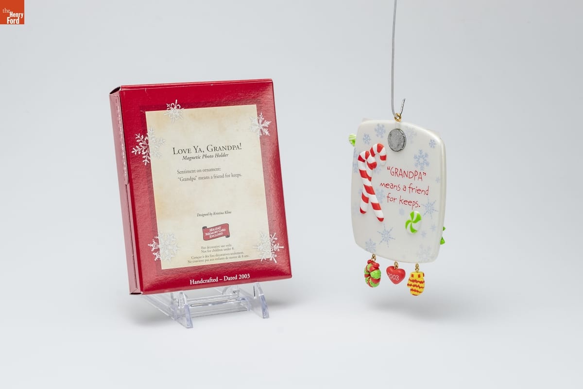 LOVE YA, GRANDPA! / Magnetic Photo Holder / Sentiment on ornament: / "Grandpa" means a friend for keeps. / Designed by Kristina Kline / HOLIDAY / MEMORY CARD / ENCLOSED / For decorative use only. / Not for children under 8. / Concue a des fins decoratives seulement. / Ne convient pas aux enfants de moins de 8 ans. / Handcrafted - Dated 2003