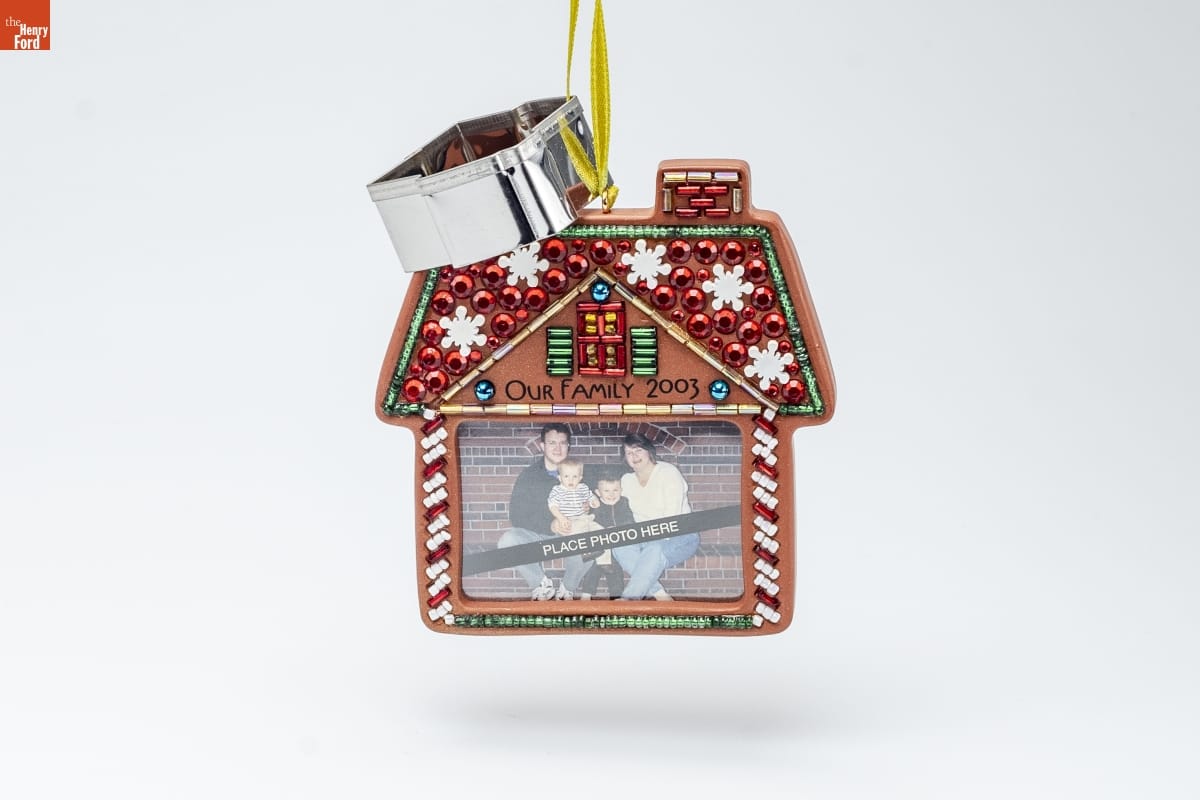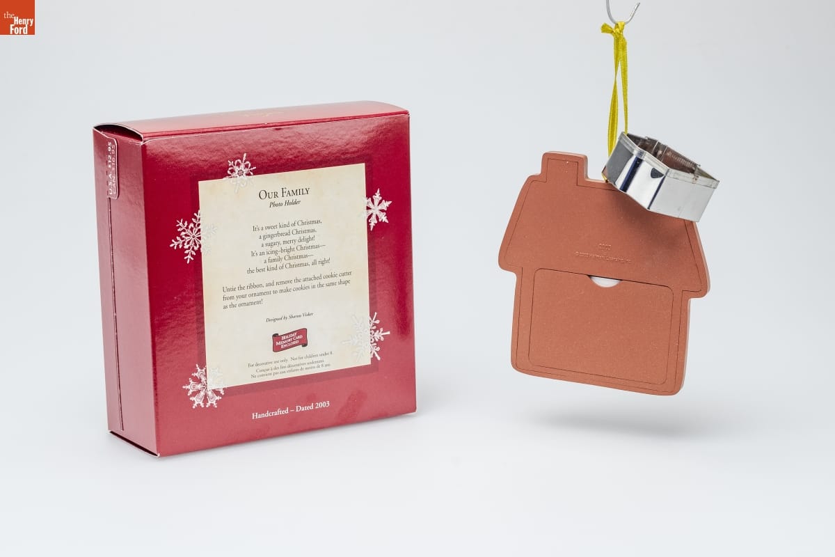 OUR FAMILY / Photo Holder / It's a sweet kind of Christmas, / a gingerbread Christmas, / a sugary, merry delight! / It's an icing-bright Christmas-- / a family Christmas-- / the best kind of Christmas, all right! / Untie the ribbon, and remove the attached cookie cutter / from your ornament to make cookies in the same shape / as the ornament! / Designed by Sharon Visker / HOLIDAY / MEMORY CARD / ENCLOSED / For decorative use only. Not for children under 8. / Concue a des fins decoratives seulement. / Ne convient pas aux enfants de moins de 8 ans. / Handcrafted - Dated 2003