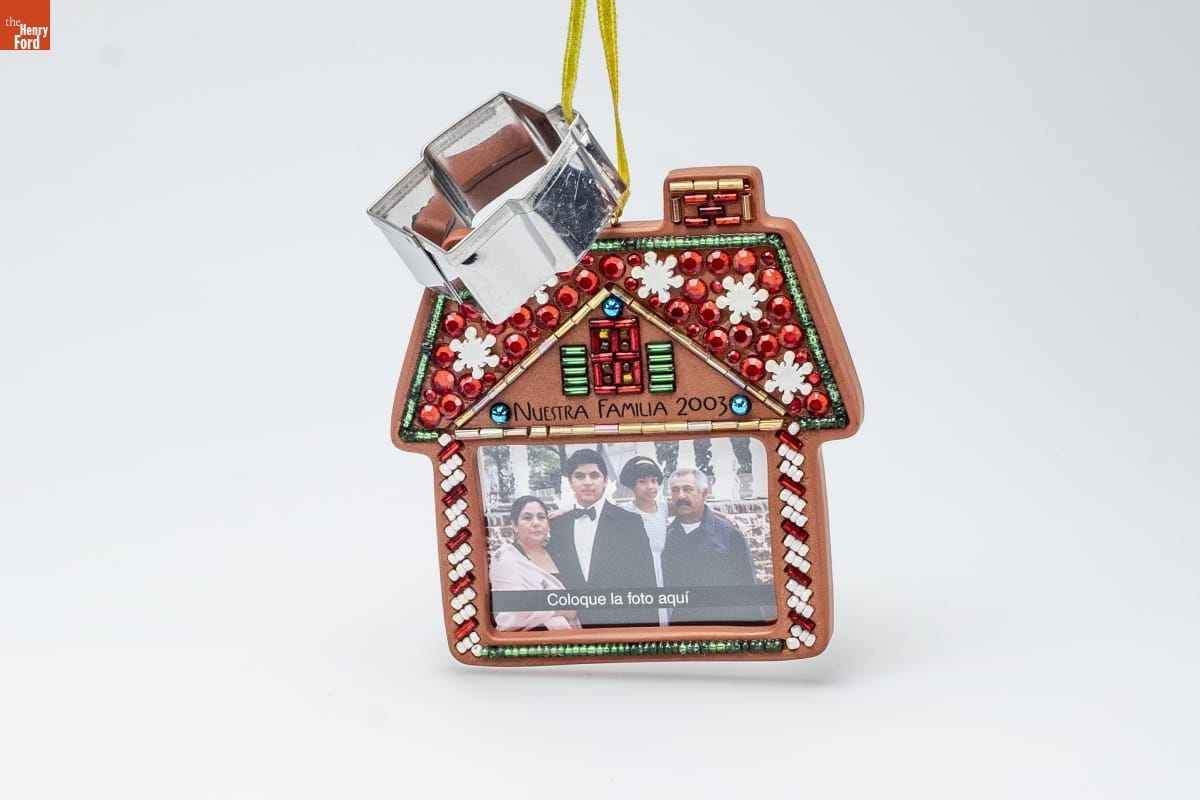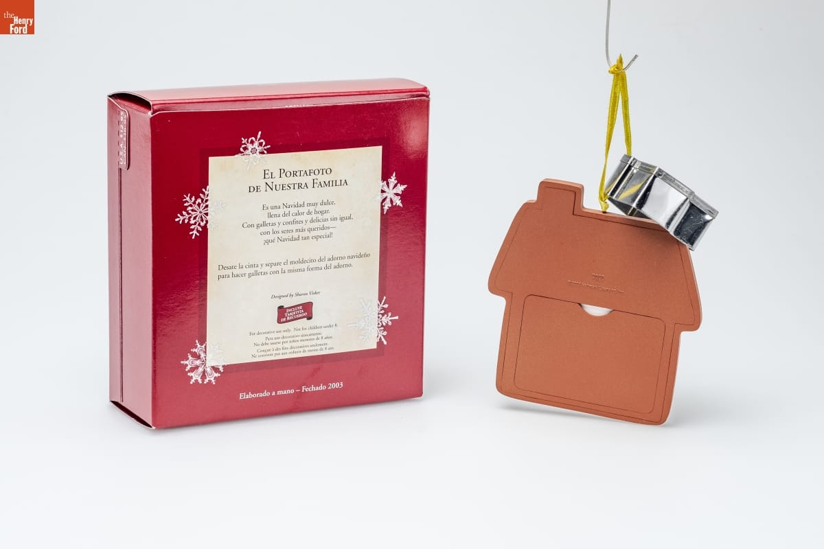 EL PORTAFOTO / DE NUESTRA FAMILIA / [OUR FAMILY PHOTO HOLDER] / Es una Navidad muy dulce, / llena del calor de hogar, / Con galletas y confites y delicias sin igual, / con los seres mas queridos -- / que Navidad tan especial! / [It's a sweet kind of Christmas, / a gingerbread Christmas, / a sugary, merry delight! / It's an icing-bright Christmas-- / a family Christmas-- / the best kind of Christmas, all right!] / Desate la cinta y separe el moldecito del adorno navideno / para hacer galletas con la misma forma del adorno. [Untie the ribbon, and remove the attached cookie cutter / from your ornament to make cookies in the same shape / as the ornament!] / Designed by Sharon Visker / INCLUYE / TARJETITA / DE RECUERDO [HOLIDAY / MEMORY CARD / ENCLOSED] / For decorative use only. Not for children under 8. / Para uso decorativo unicamente. / No debe usarse por ninos menores de 8 anos. / Concue a des fins decoratives seulement. / Ne convient pas aux enfants de moins de 8 ans. / Elaborado a mano [Handcrafted] - Fechado [Dated] 2003