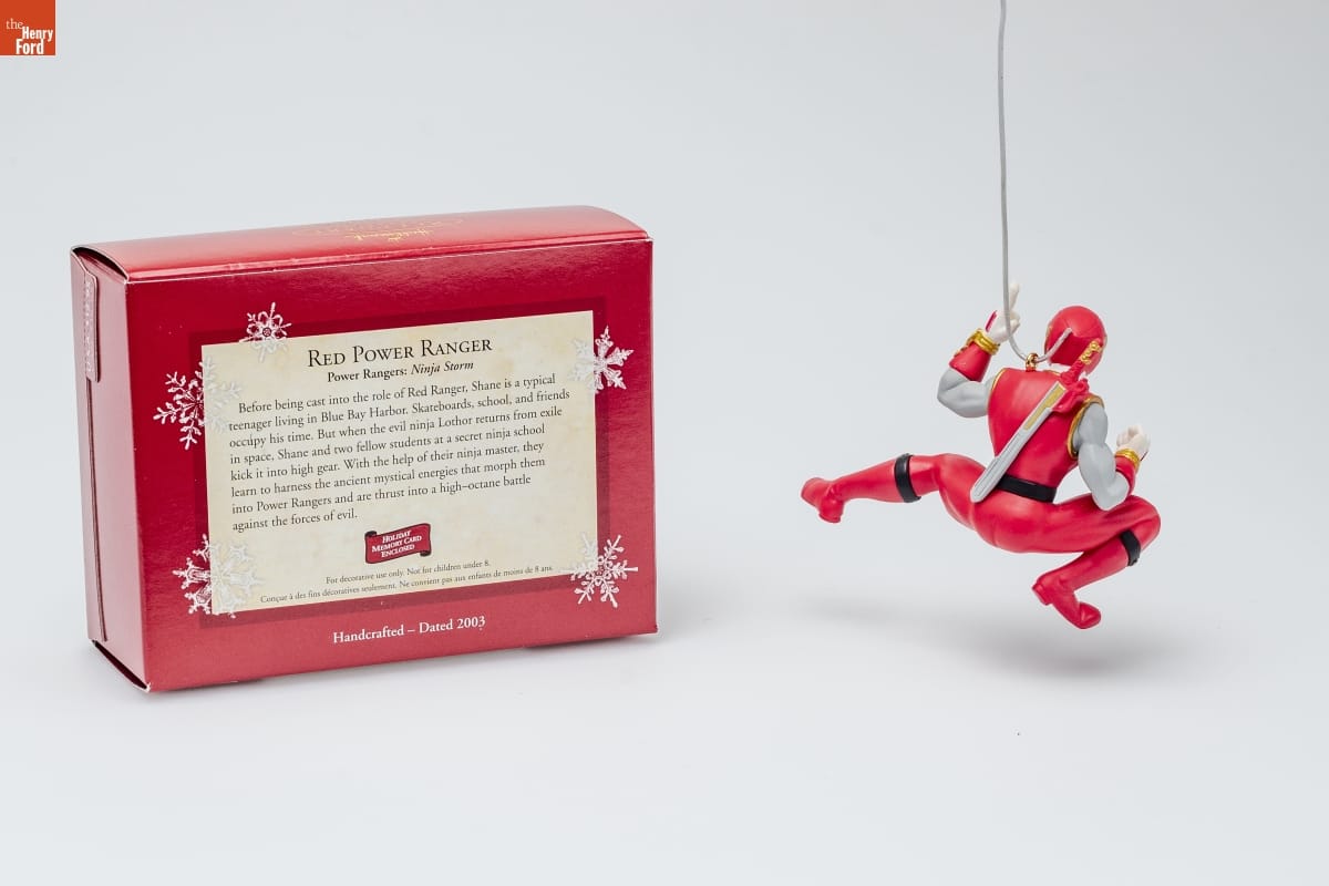 RED POWER RANGER / Power Rangers: Ninja Storm / Before being cast into the role of Red Ranger, Shane is a typical / teenager living in Blue Bay Harbor. Skatebards, school, and friends / occupy his time. But when the evil ninja Lothor returns from exile / in space, Shane and two fellow students at a secret ninja school / kick it into high gear. With the help of their ninja master, they / learn to harness the ancient mystical energies that morph them / into Power Rangers and are thrust into a high-octane battle / against the forces of evil. / HOLIDAY / MEMORY CARD / ENCLOSED / For decorative use only. Not for children under 8. / Concue a des fins decoratives seulement. Ne convient pas aux enfants de moins de 8 ans. / Handcrafted - Dated 2003