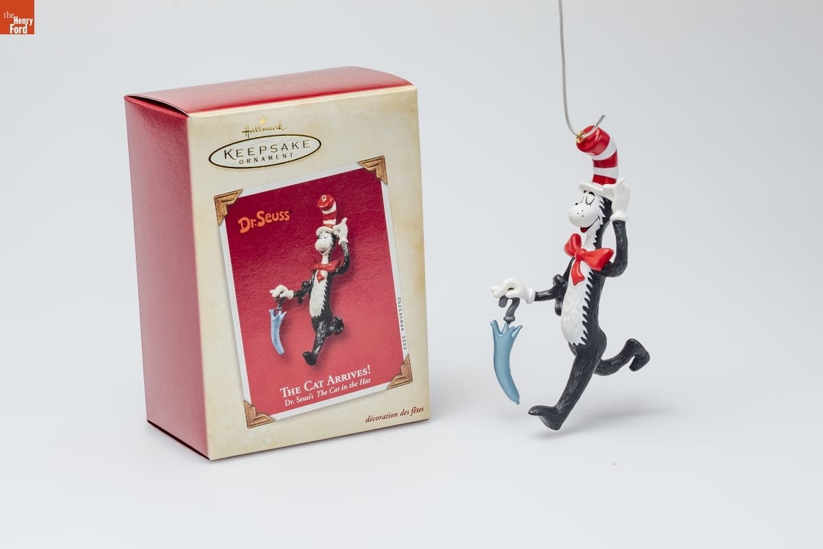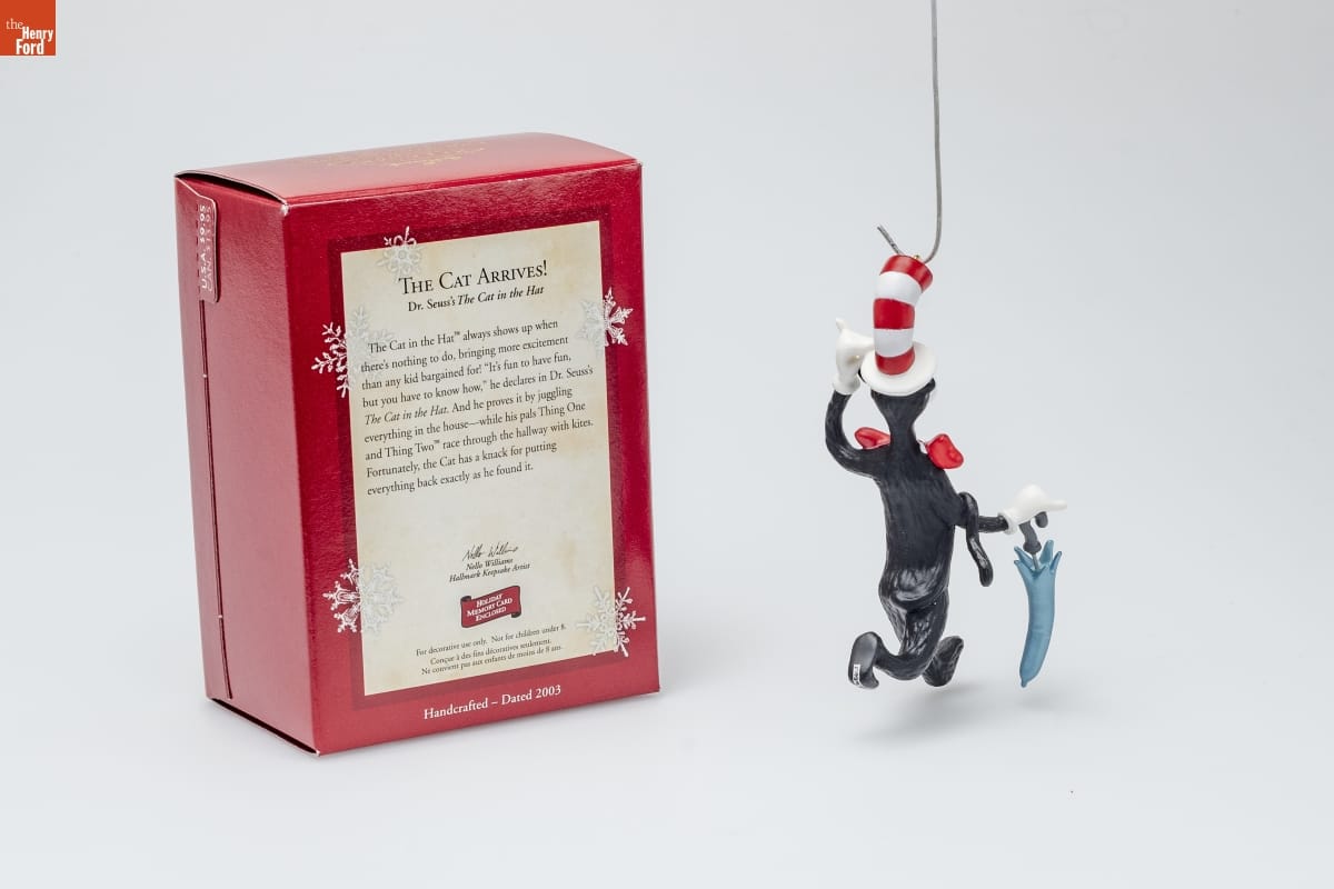 THE CAT ARRIVES! / Dr. Seuss's The Cat in the Hat / The Cat in the Hat TM always shows up when / there's nothing to do, bringing more excitement / than any kid bargained for! "It's fun to have fun, / but you have to know how," he declares in Dr. Seuss's / The Cat in the Hat. And he proves it by juggling / everything in the house--while his pals Thing One / and Thing Two TM race through the hallway with kites. / Fortunately, the Cat has a knack for putting / everything back exactly as he found it. / Nello Williams / Hallmark Keepsake Artist / HOLIDAY / MEMORY CARD / ENCLOSED / For decorative use only. Not for children under 8. / Concue a des fins decoratives seulement. / Ne convient pas aux enfants de moins de 8 ans. / Handcrafted - Dated 2003