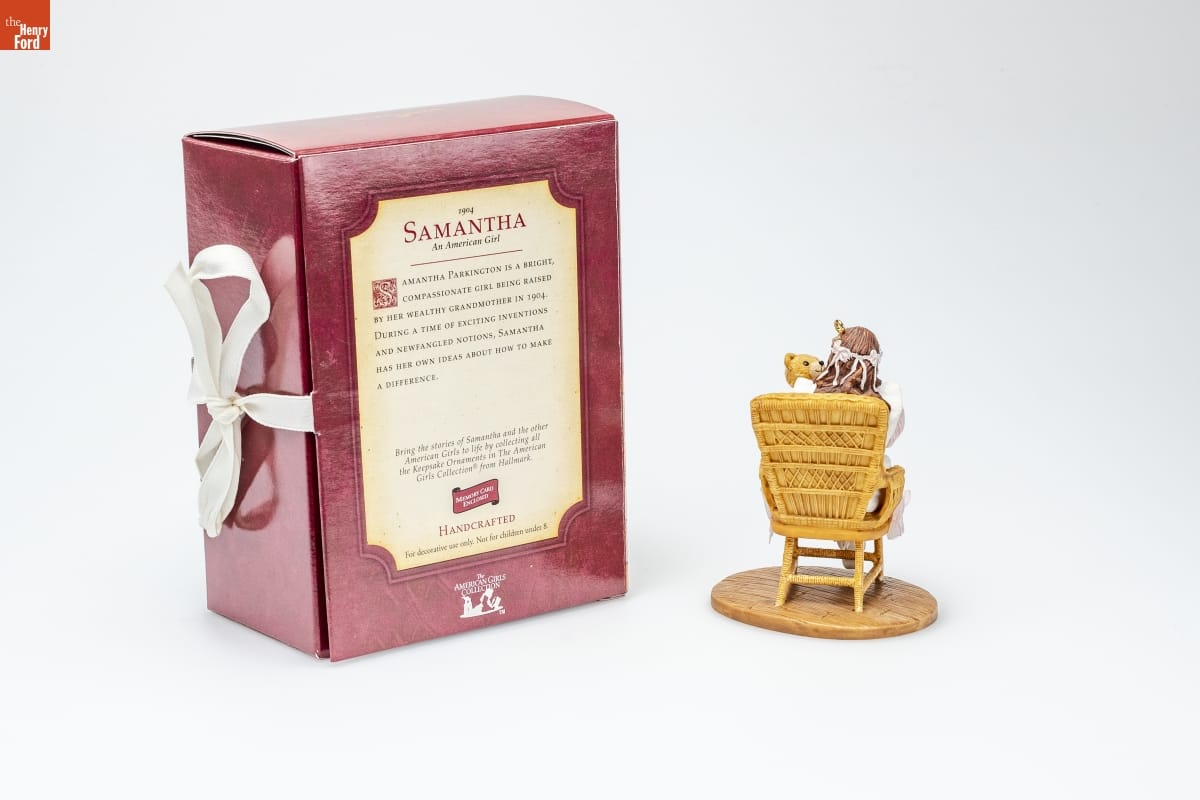 1904 / SAMANTHA / An American Girl / SAMANTHA PARKINGTON IS A BRIGHT, / COMPASSIONATE GIRL BEING RAISED / BY HER WEALTHY GRANDMOTHER IN 1904. / DURING A TIME OF EXCITING INVENTIONS / AND NEWFANGLED NOTIONS, SAMANTHA / HAS HER OWN IDEAS ABOUT HOW TO MAKE / A DIFFERENCE. / Bring the stories of Samantha and the other / American Girls to life by collecting all / the Keepsake Ornaments in The American / Girls Collection(R) from Hallmark. / MEMORY CARD / ENCLOSED / HANDCRAFTED / For decorative use only. Not for children under 8. / The / AMERICAN GIRLS / COLLECTION TM
