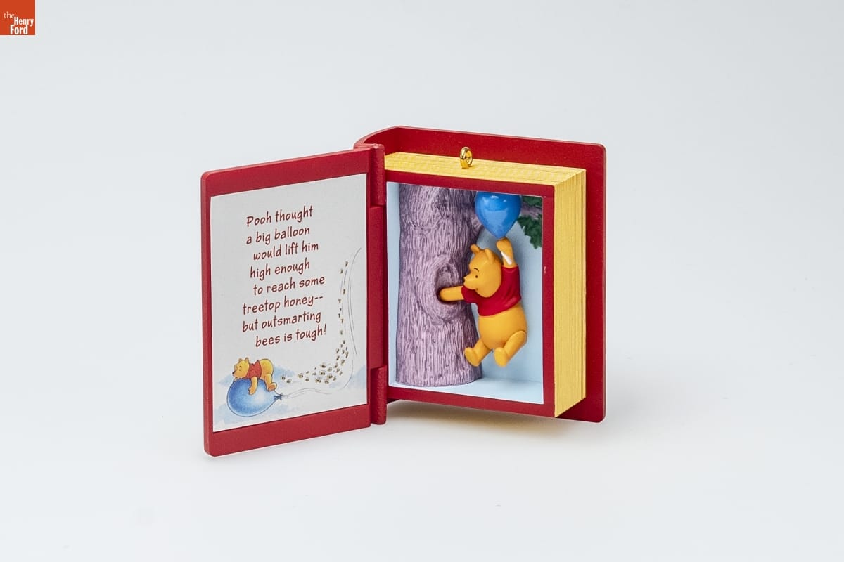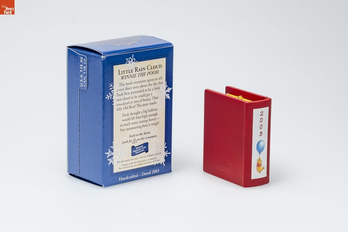 LITTLE RAIN CLOUD / WINNIE THE POOH / This book ornament opens to tell / a very short story about the day that / Pooh Bear pretended to be a little / rain cloud so he could get a / smackerel or two of honey. That / Silly Old Bear! The story reads: / Pooh thought a big balloon / would lift him high enough / to reach some treetop honey-- / but outsmarting bees is tough! / Sixth in the Series. / Look for 6 on this ornament. / HOLIDAY / MEMORY CARD / ENCLOSED / For decorative use only. Not for children under 8. / Concue a des fins decoratives seulement. / Ne convient pas aux enfants de moins de 8 ans. / Handcrafted - Dated 2003
