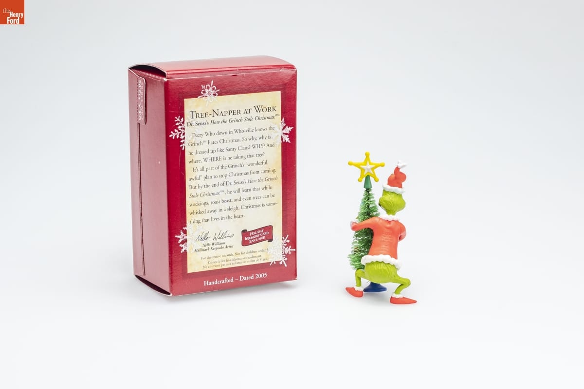 TREE-NAPPER AT WORK / Dr. Seuss's How the / Grinch Stole Christmas! [TM] / Every Who down in Who-ville knows the / Grinch [TM] hates Christmas. So why, why is / he dressed up like Santy Claus! WHY? And / where, WHERE is he taking that tree? / It's all part of the Grinch's "wonderful, / awful" plan to stop Christmas from coming. / But by the end of Dr. Seuss's How the Grinch / Stole Christmas! [TM], he will learn that while / stockings, roast beast, and even trees can be / whisked away in a sleigh, Christmas is some- / thing that lives in the heart. / Nello Williams / Hallmark Keepsake Artist / HOLIDAY / MEMORY CARD / ENCLOSED / For decorative use only. Not for children under 8. / Concu a des fins decoratives seulement. / Ne convient pas aux enfants de moins de 8 ans. / Handcrafted - Dated 2005