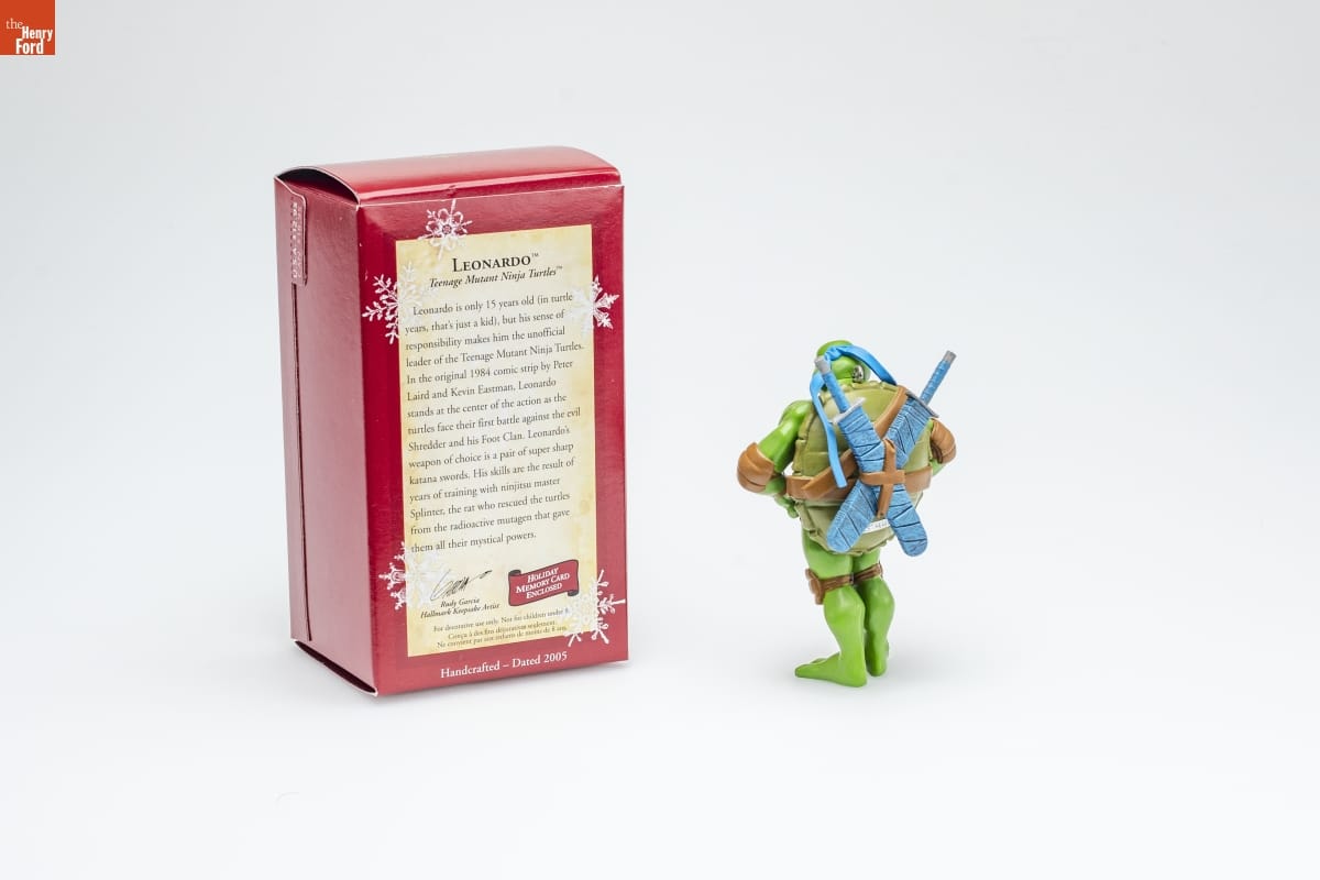 LEONARDO [TM] / Teenage Mutant Ninja Turtles [TM] / Leonardo is only 15 years old (in turtle / years, that's just a kid), but his sense of / responsibility makes him the unofficial / leader of the Teenage Mutant Ninja Turtles. / In the original 1984 comic strip by Peter Laird and Kevin Eastman, Leonardo / stands at the center of the action as the / turtles face their first battle against the evil / Shredder and his Foot Clan. Leonardo's / weapon of choice is a pair of super sharp / katana swords. His skills are the result of / Splinter, the rat who rescured the turtles / from the radioactive mutagen that gave / them all their mystical powers. / Rudy Garcia / Hallmark Keepsake Artist / HOLIDAY / MEMORY CARD / ENCLOSED / For decorative use only. Not for children under 8. / Concu a des fins decoratives seulement. / Ne convient pas aux enfants de moins de 8 ans. / Handcrafted - Dated 2005