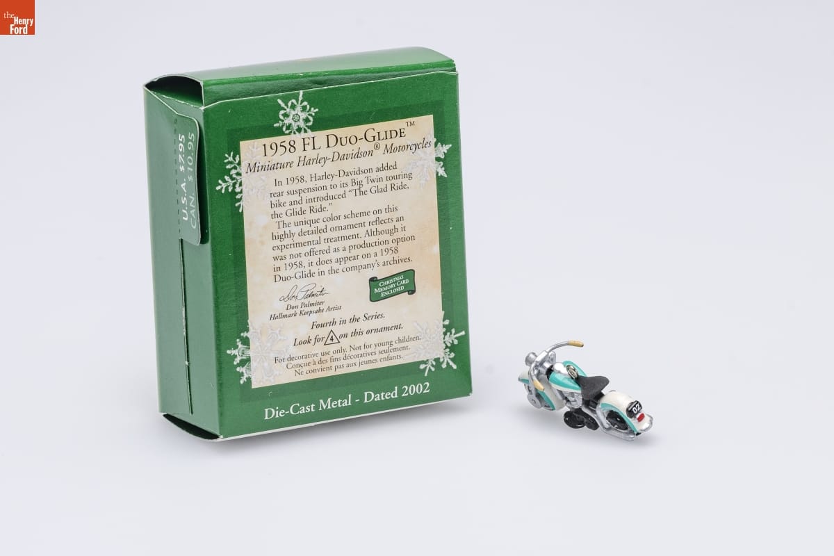 1958 FL DUO-GLIDE TM / Miniature Harley-Davidson(R) Motorcycles / In 1958, Harley-Davidson added / rear suspension to its Big Twin touring / bike and introduced "The Glad Ride, / the Glide Ride." / The unique color scheme on this / highly detailed ornament reflects an / experimental treatment. Although it / was not offered as a production option / in 1958, it does appear on a 1958 / Duo-Glide in the company's archives. / CHRISTMAS / MEMORY CARD / ENCLOSED / Don Palmiter / Hallmark Keepsake Artist / Fourth in the Series. / Look for 4 on this ornament. / For decorative use only. Not for young children. / Concue a des fins decoratives seulement. / Ne convient pas aux jeunes enfants. / Die-Cast Metal - Dated 2002
