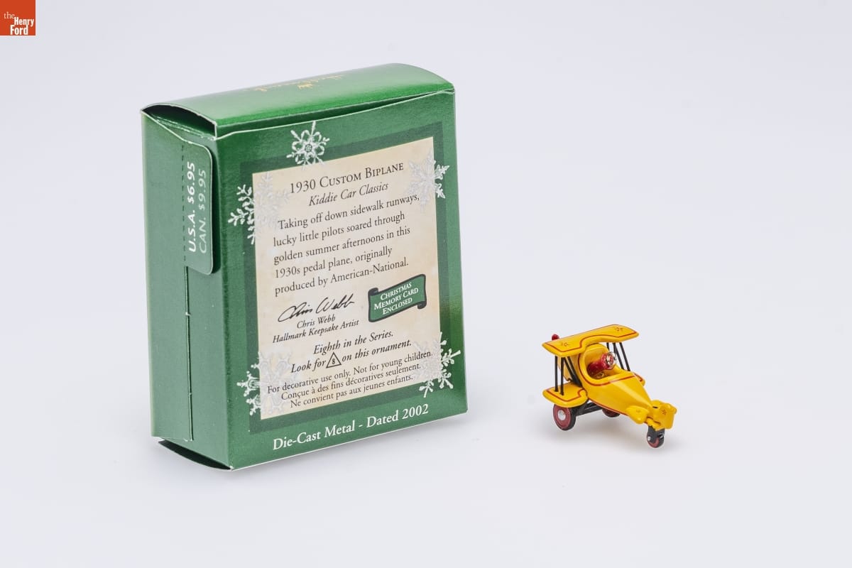 1930 CUSTOM BIPLANE / Kiddie Car Classics / Taking off down sidewalk runways, / lucky little pilots soared through / golden summer afternoons in this / 1930s pedal plane, originally / produced by American-National. / CHRISTMAS / MEMORY CARD / ENCLOSED / Chris Webb / Hallmark Keepsake Artist / Eighth in the Series. / Look for 8 on this ornament. / For decorative use only. Not for young children. / Concue a des fins decoratives seulement. / Ne convient pas aux jeunes enfants. / Die-Cast Metal - Dated 2002