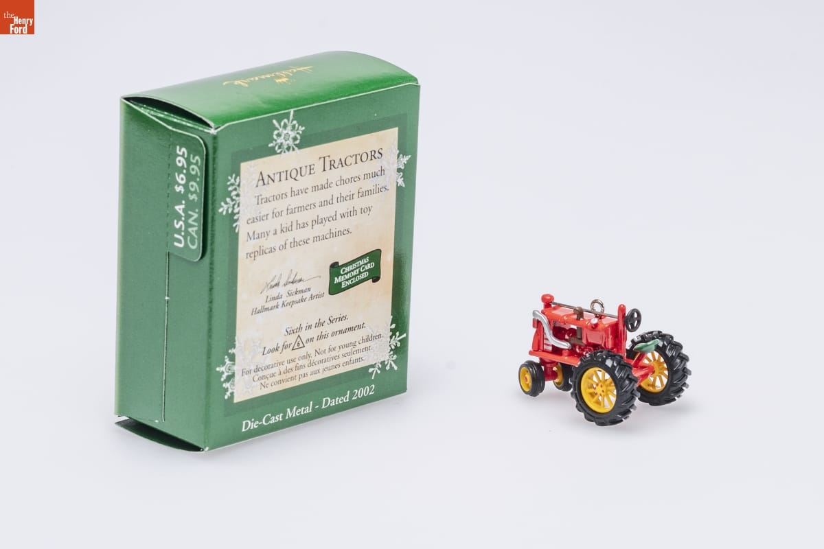 ANTIQUE TRACTORS / Tractors have made chores much / easier for farmers and their families. / Many a kid has played with toy / replicas of these machines. / CHRISTMAS / MEMORY CARD / ENCLOSED / Linda Sickman / Hallmark Keepsake Artist / Sixth in the Series. / Look for 6 on this ornament. / For decorative use only. Not for young children. / Concue a des fins decoratives seulement. / Ne convient pas aux jeunes enfants. / Die-Cast Metal - Dated 2002
