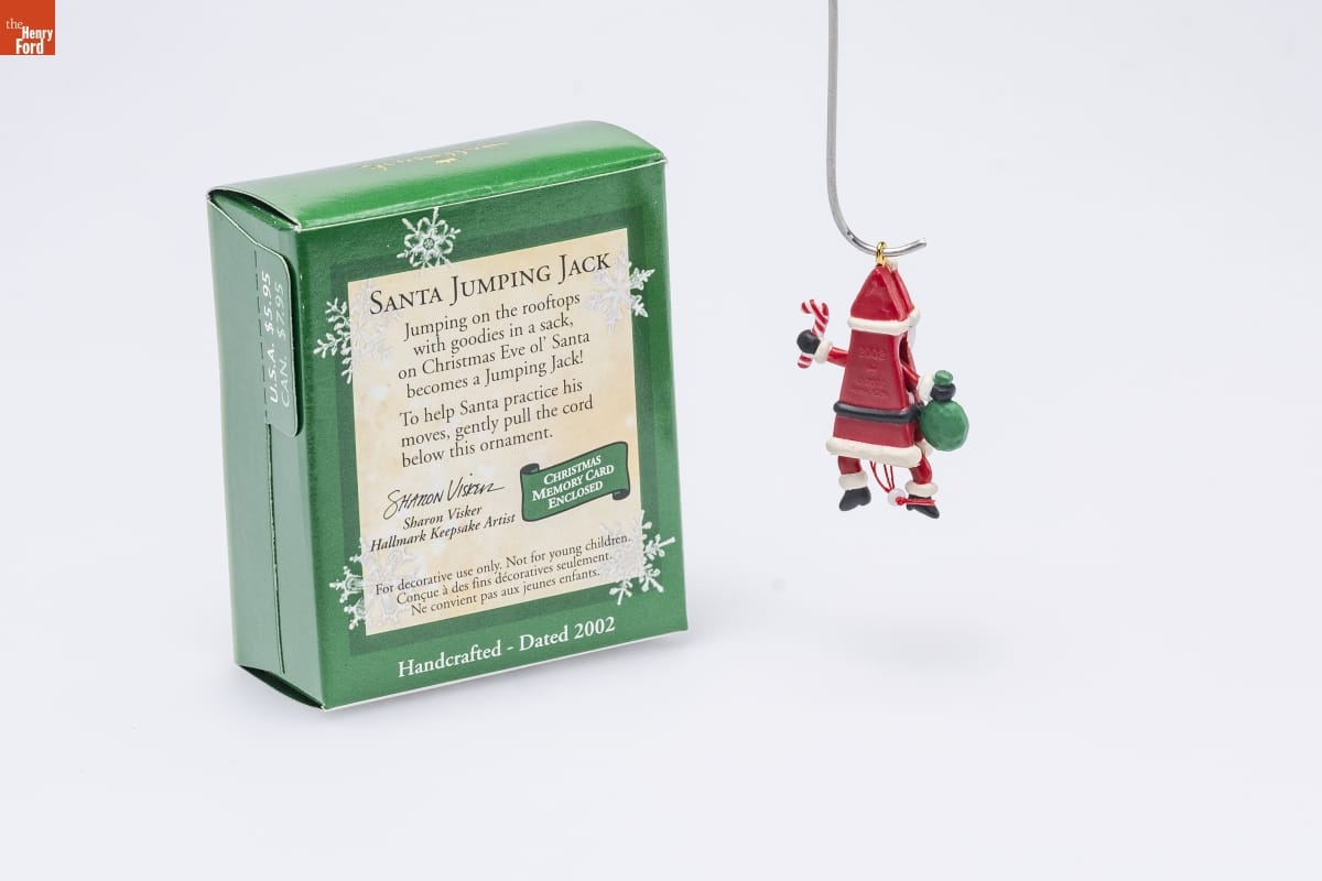 SANTA JUMPING JACK / Jumping on the rooftops / with goodies in a sack, / on Christmas Eve ol' Santa / becomes a Jumping Jack! / To help Santa practice his / moves, gently pull the cord / below this ornament. / CHRISTMAS / MEMORY CARD / ENCLOSED / Sharon Visker / Hallmark Keepsake Artist / For decorative use only. Not for young children. / Concue a des fins decoratives seulement. / Ne convient pas aux jeunes enfants. / Handcrafted - Dated 2002