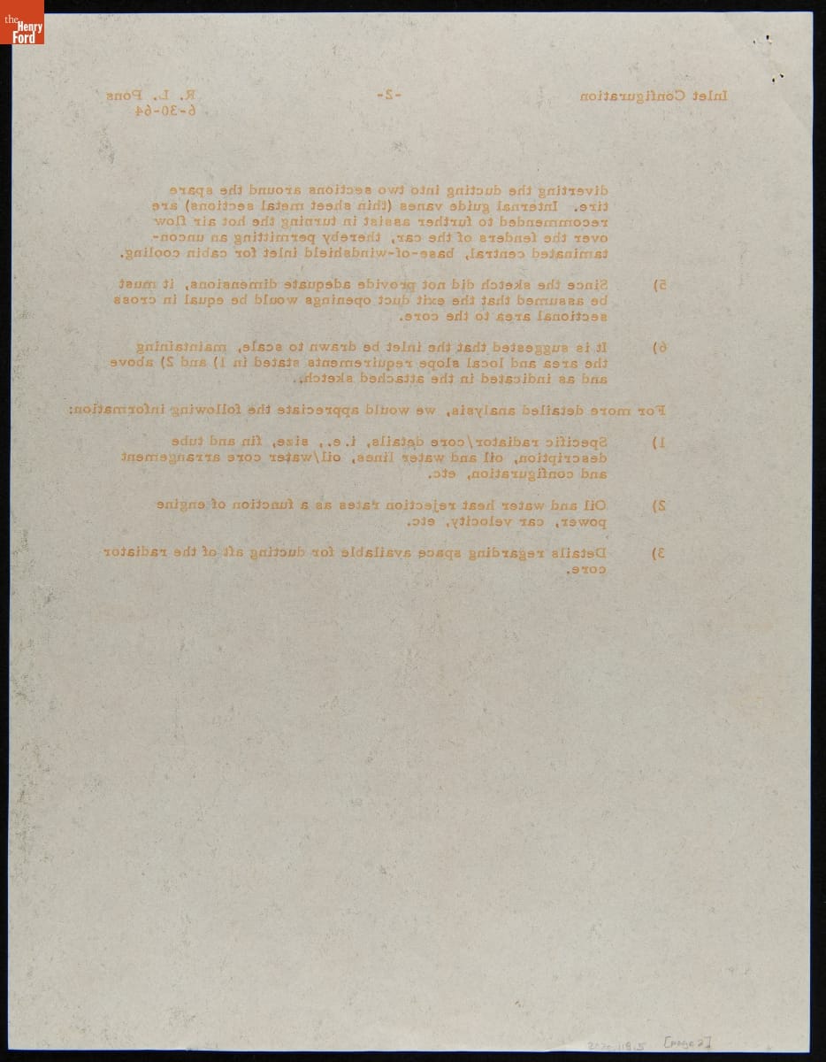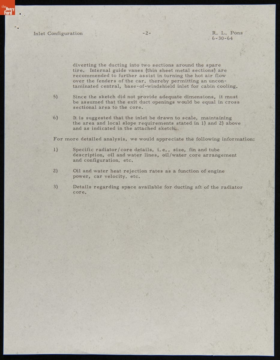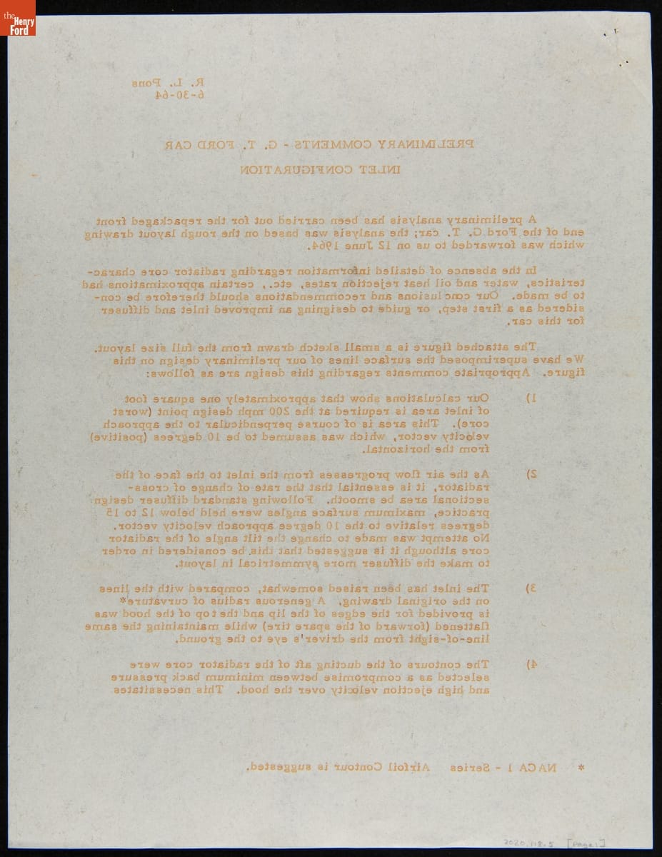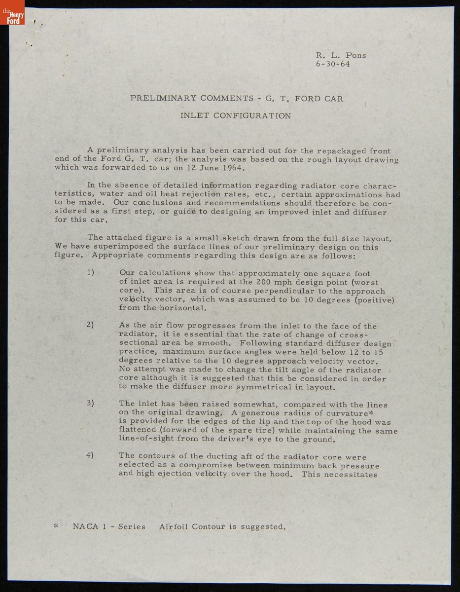 Report, "Preliminary Comments - GT Ford Car Inlet Configuration," June 30, 1964