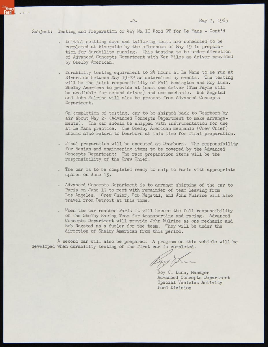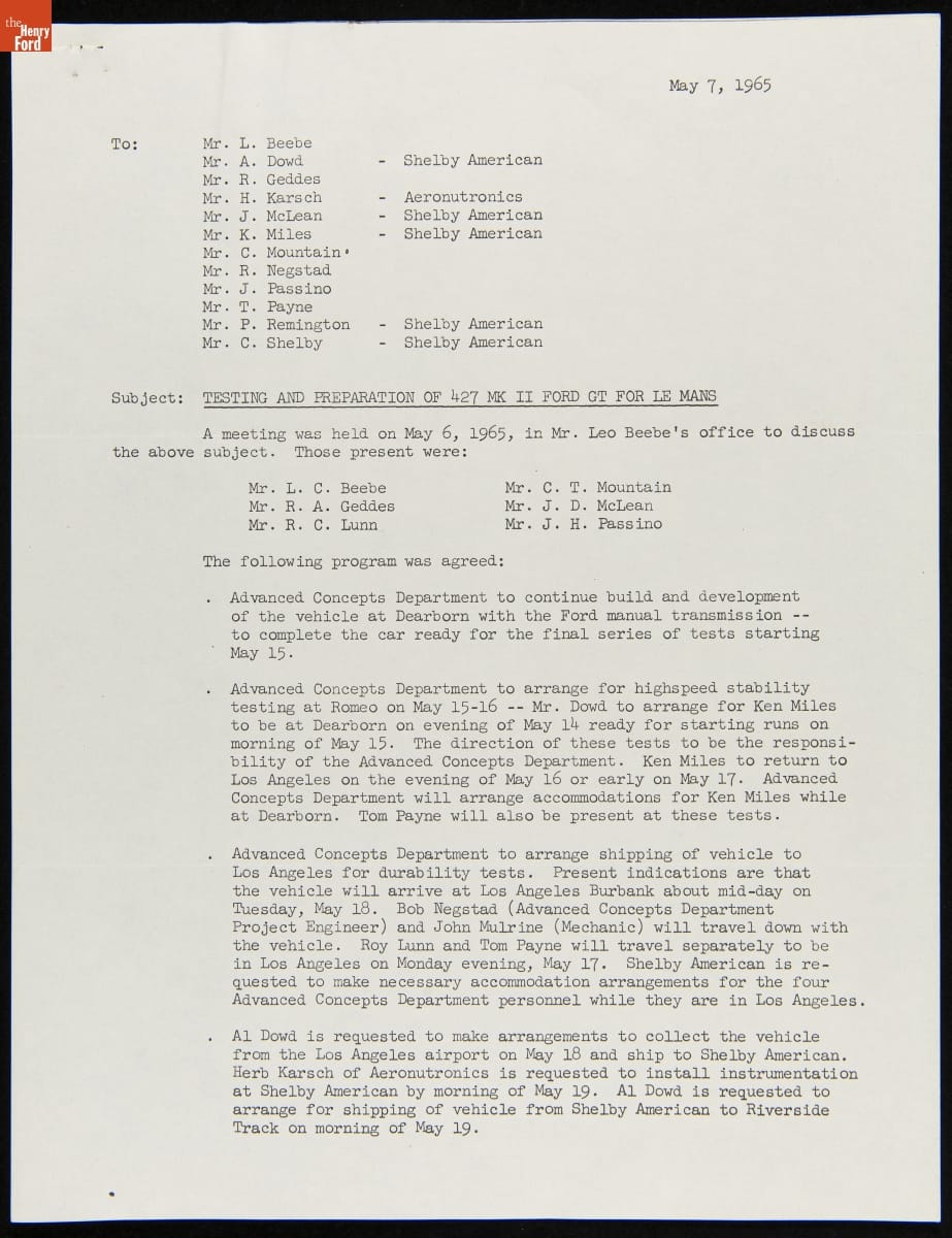 In the mid-1960s, Ford Motor Company competed at the 24 Hours of Le Mans with the all-new Ford GT40 race car. The day-to-day efforts were managed by Carroll Shelby's Shelby American racing team. This memo described preparations for the 1965 Le Mans contest, where Shelby American entered two GT40s powered by Ford's 427-cubic-inch V-8. Neither car finished the race.