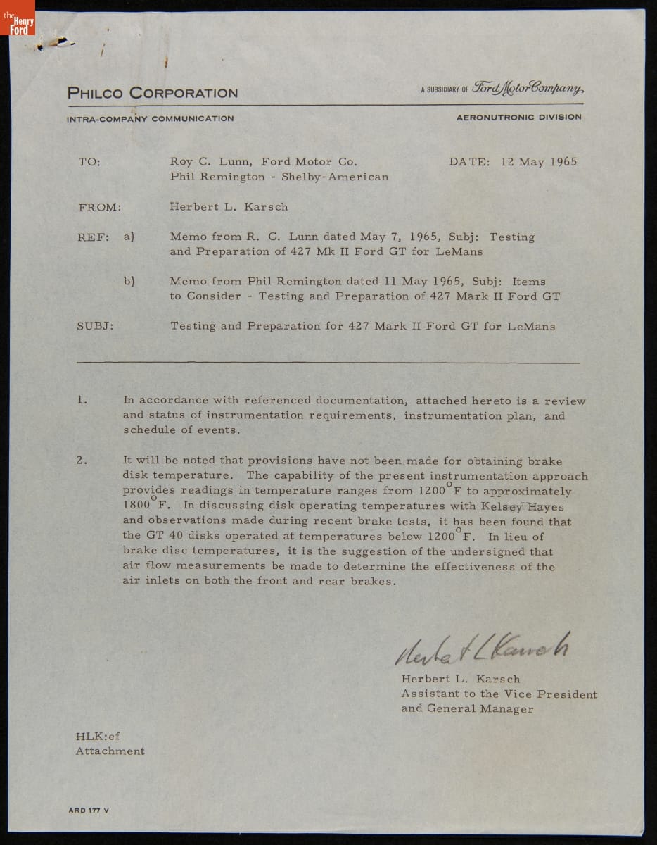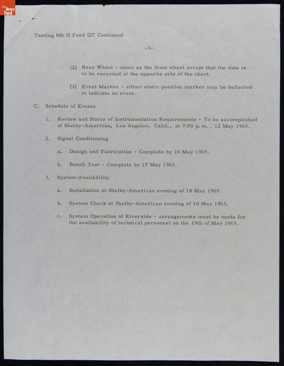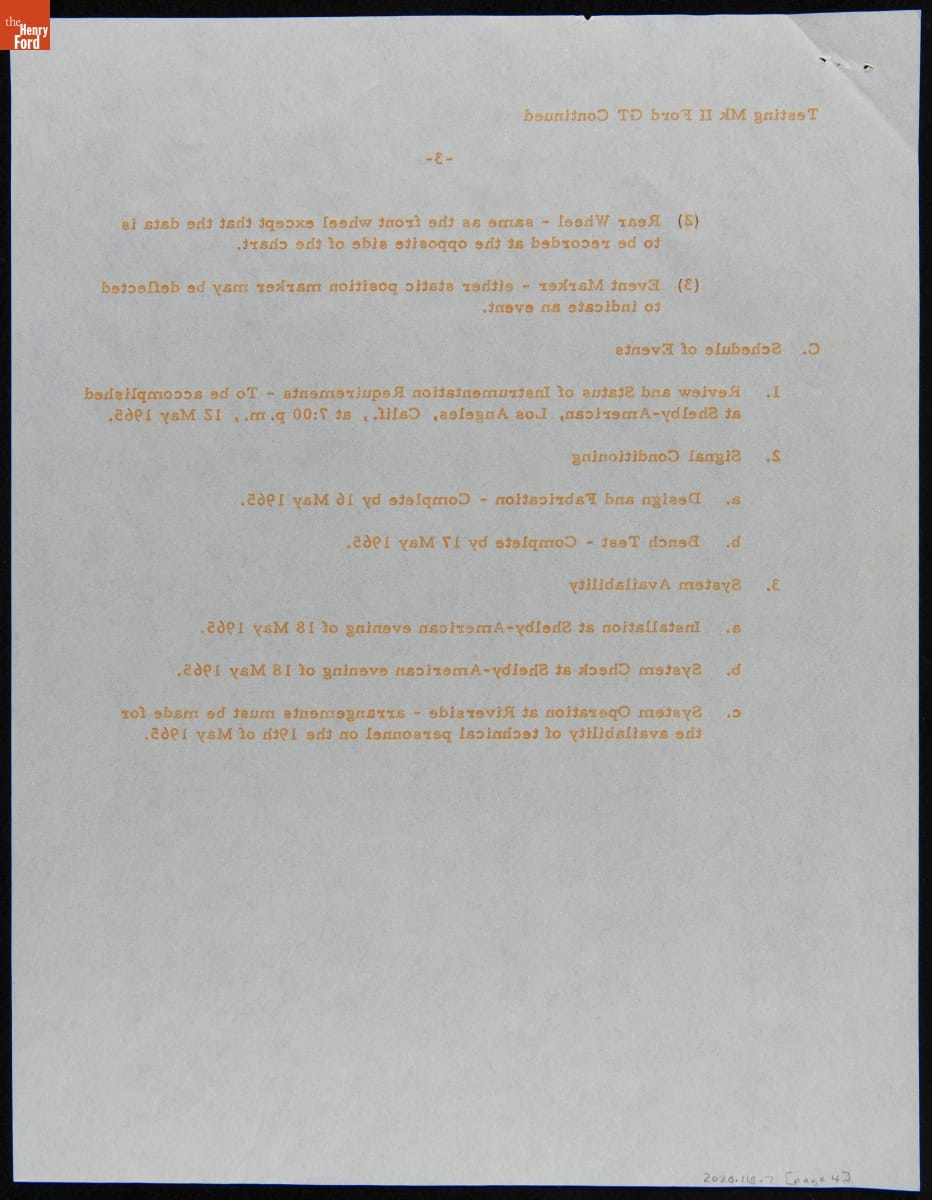 In the mid-1960s, Ford Motor Company competed at the 24 Hours of Le Mans with the all-new Ford GT40 race car. The day-to-day efforts were managed by Carroll Shelby's Shelby American racing team. This memo described preparations for the 1965 Le Mans contest, where Shelby American entered two GT40s powered by Ford's 427-cubic-inch V-8. Neither car finished the race.