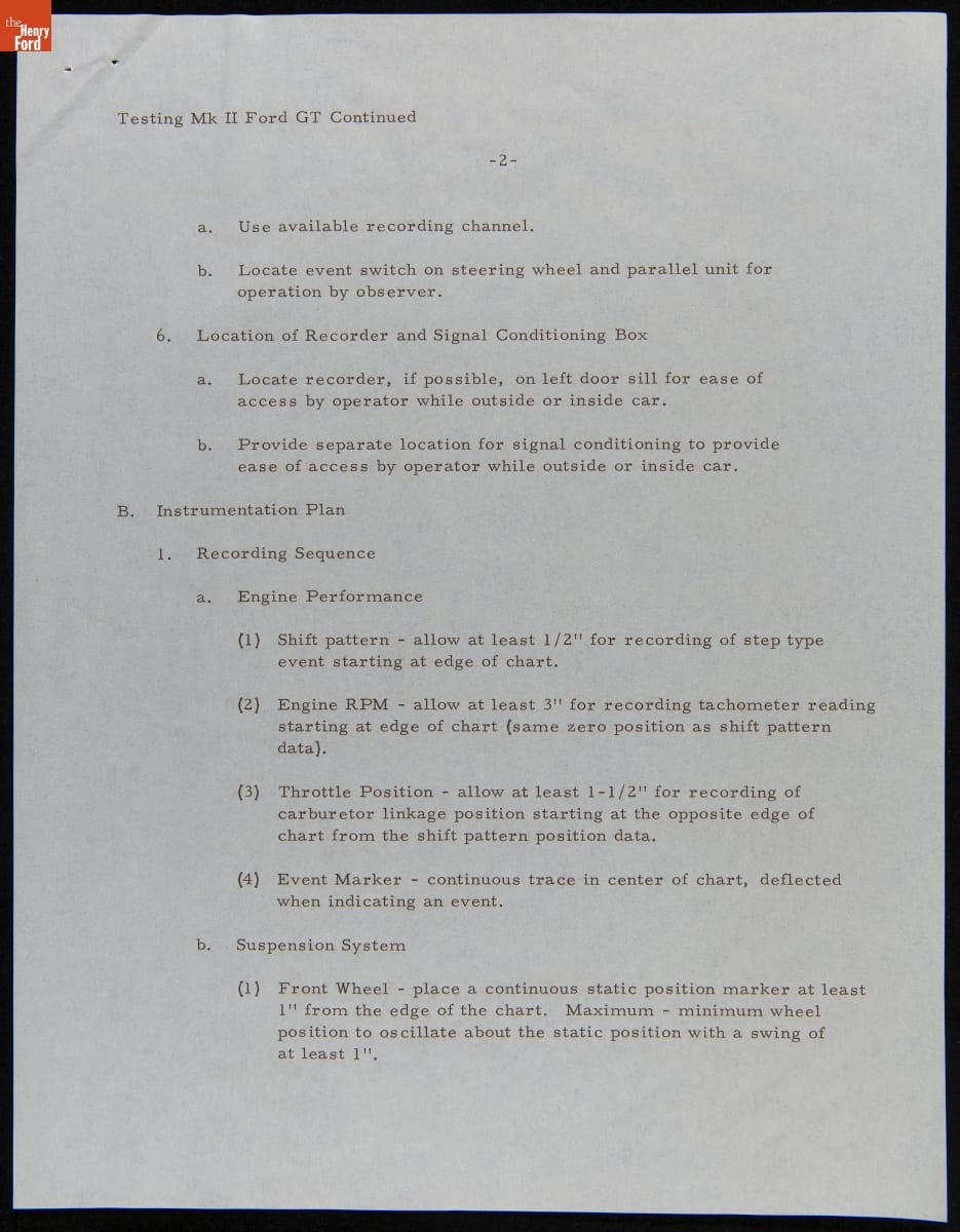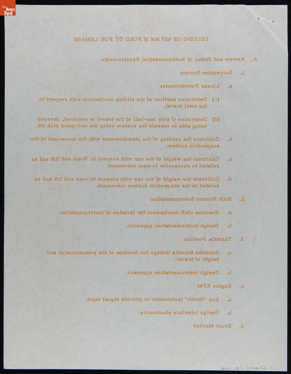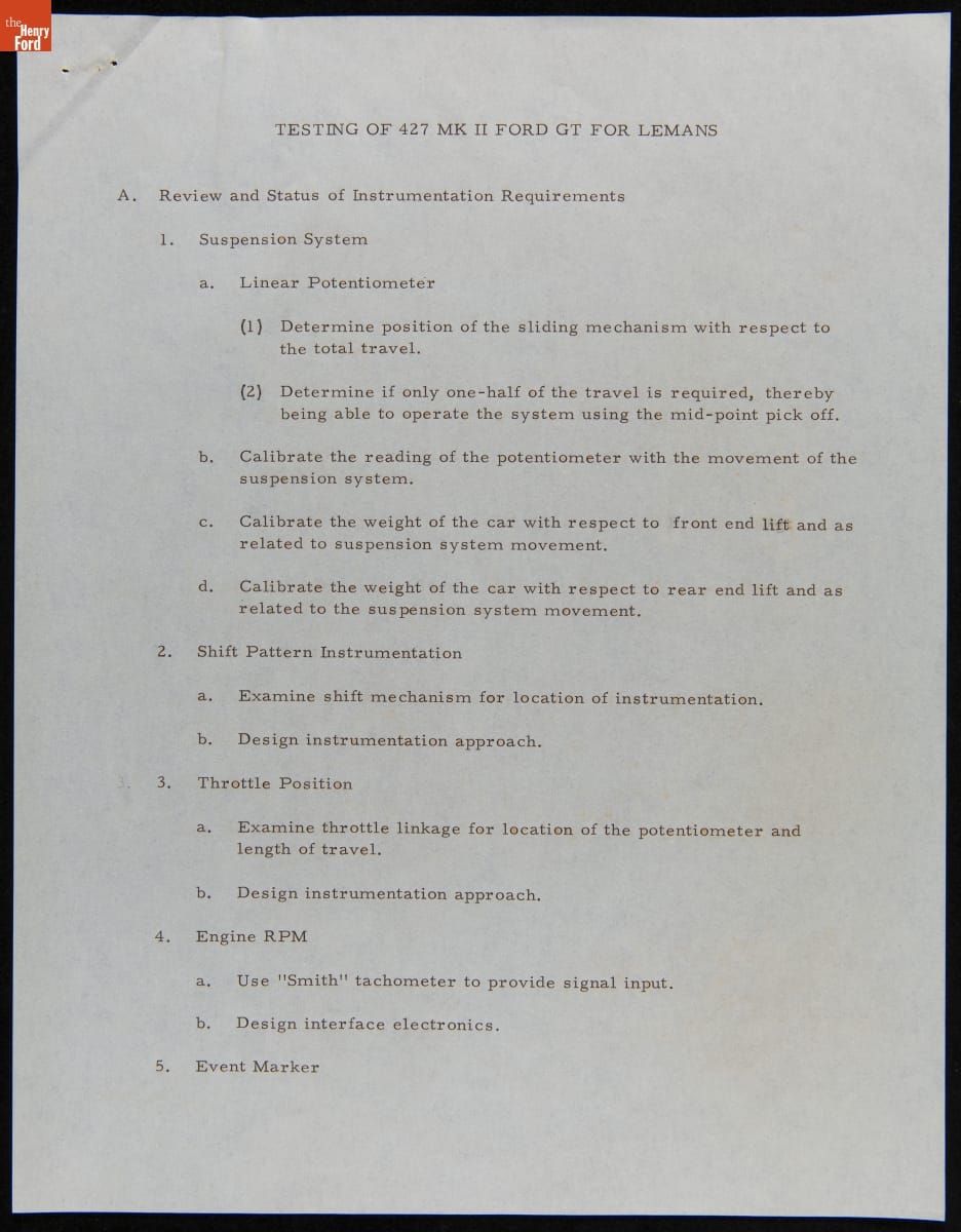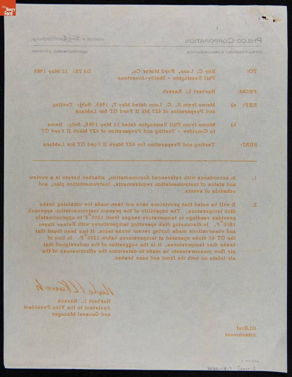 In the mid-1960s, Ford Motor Company competed at the 24 Hours of Le Mans with the all-new Ford GT40 race car. The day-to-day efforts were managed by Carroll Shelby's Shelby American racing team. This memo described preparations for the 1965 Le Mans contest, where Shelby American entered two GT40s powered by Ford's 427-cubic-inch V-8. Neither car finished the race.