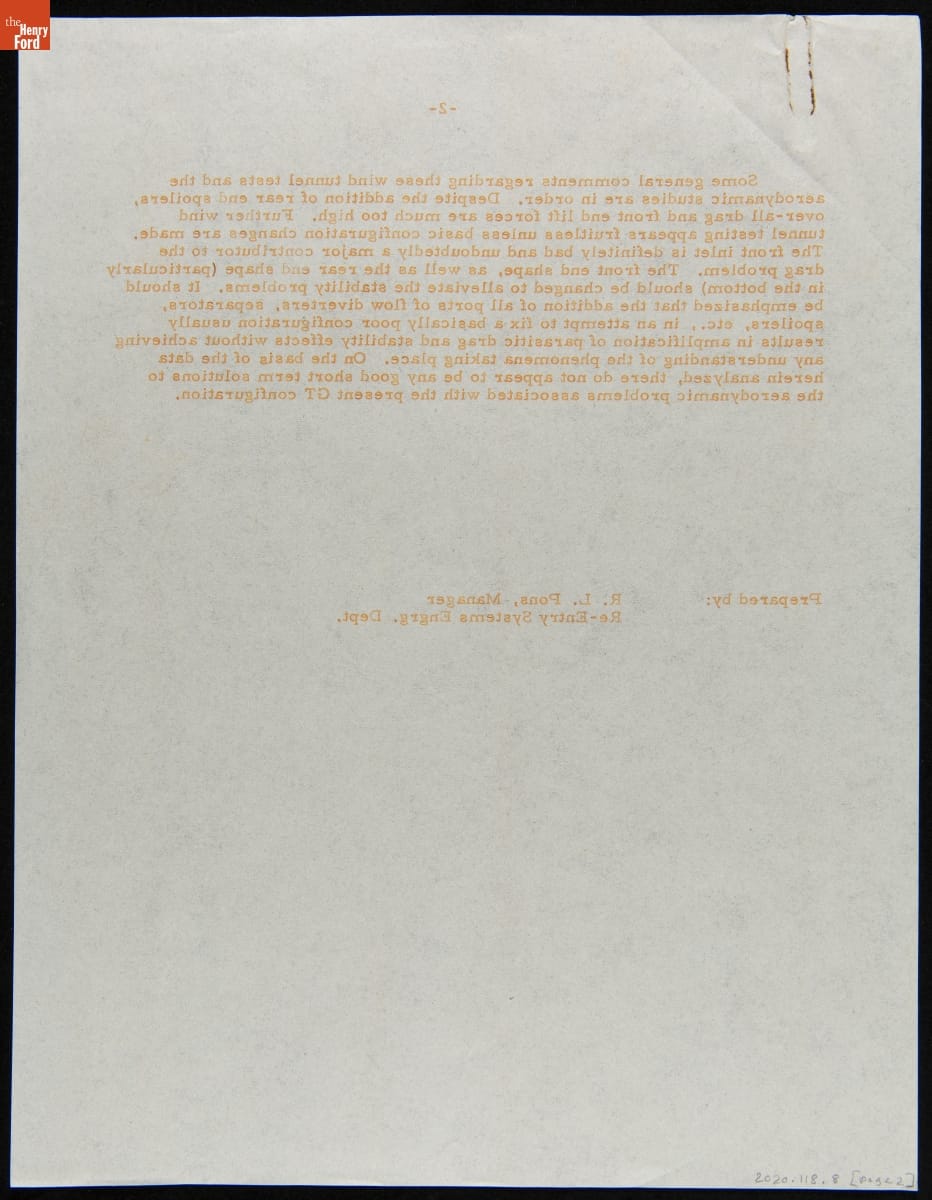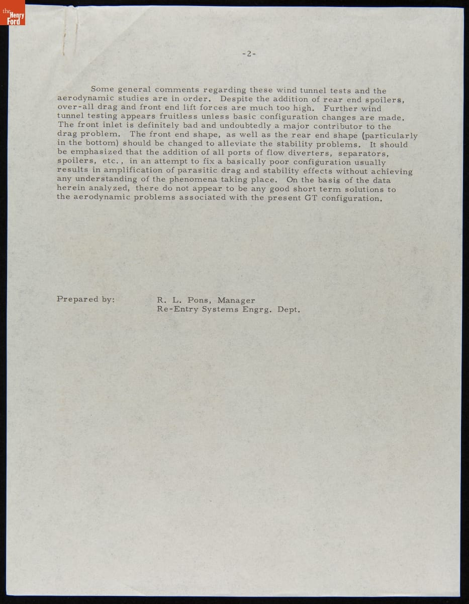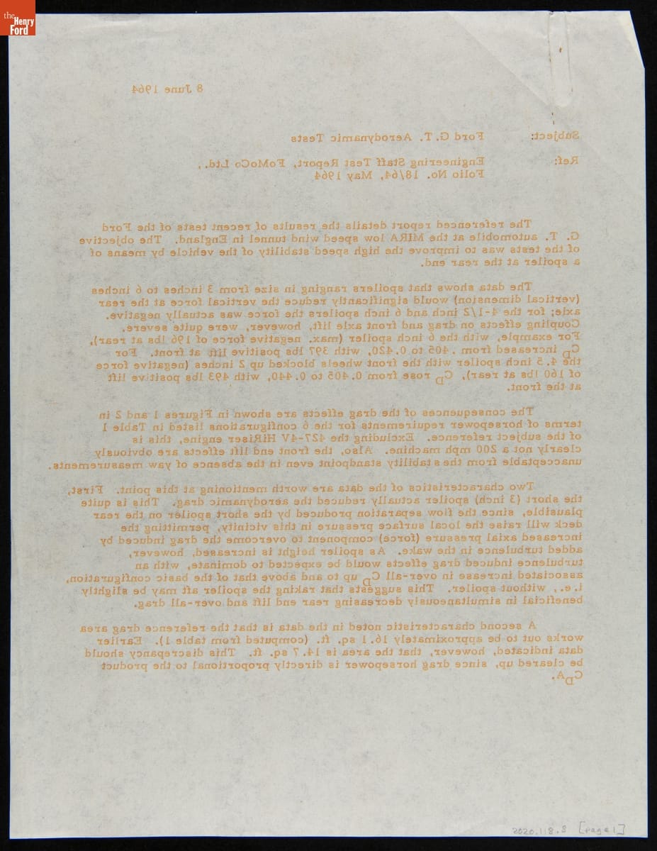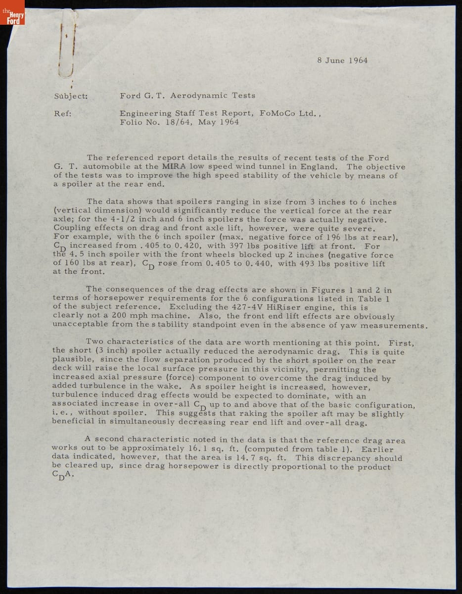 In the mid-1960s, Ford Motor Company designed and built a new GT car for endurance races like France's 24 Hours of Le Mans. It was part of a larger effort to give the company a sportier image and attract younger customers. This memo detailed results from wind tunnel tests with a Ford GT car in Great Britain in 1964.