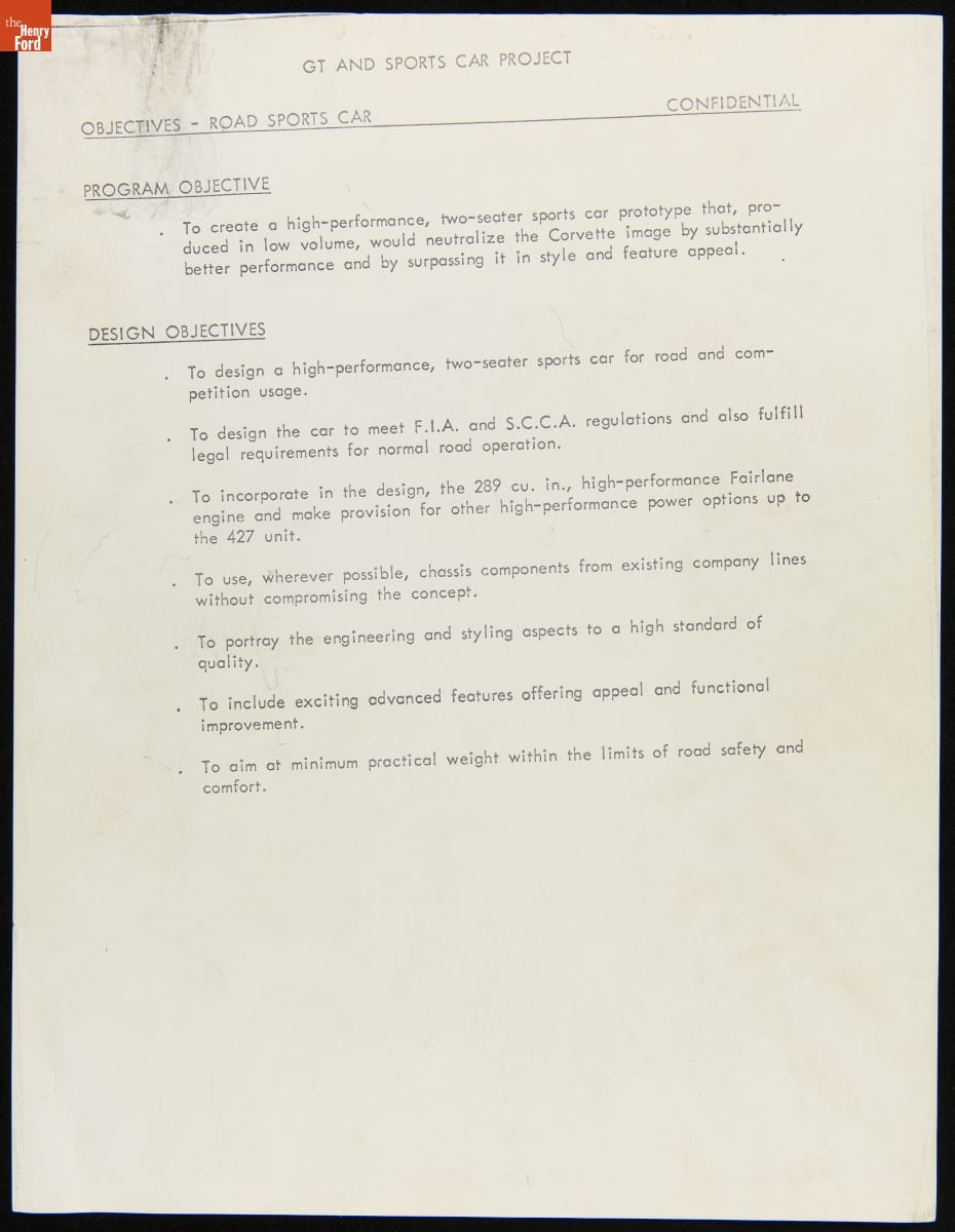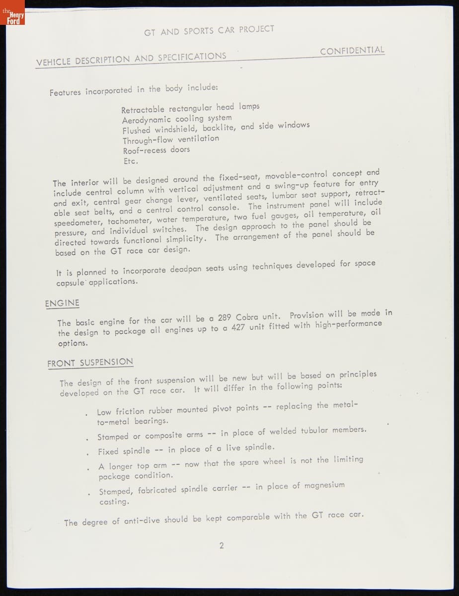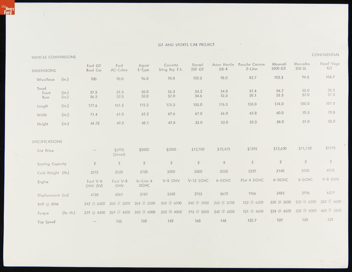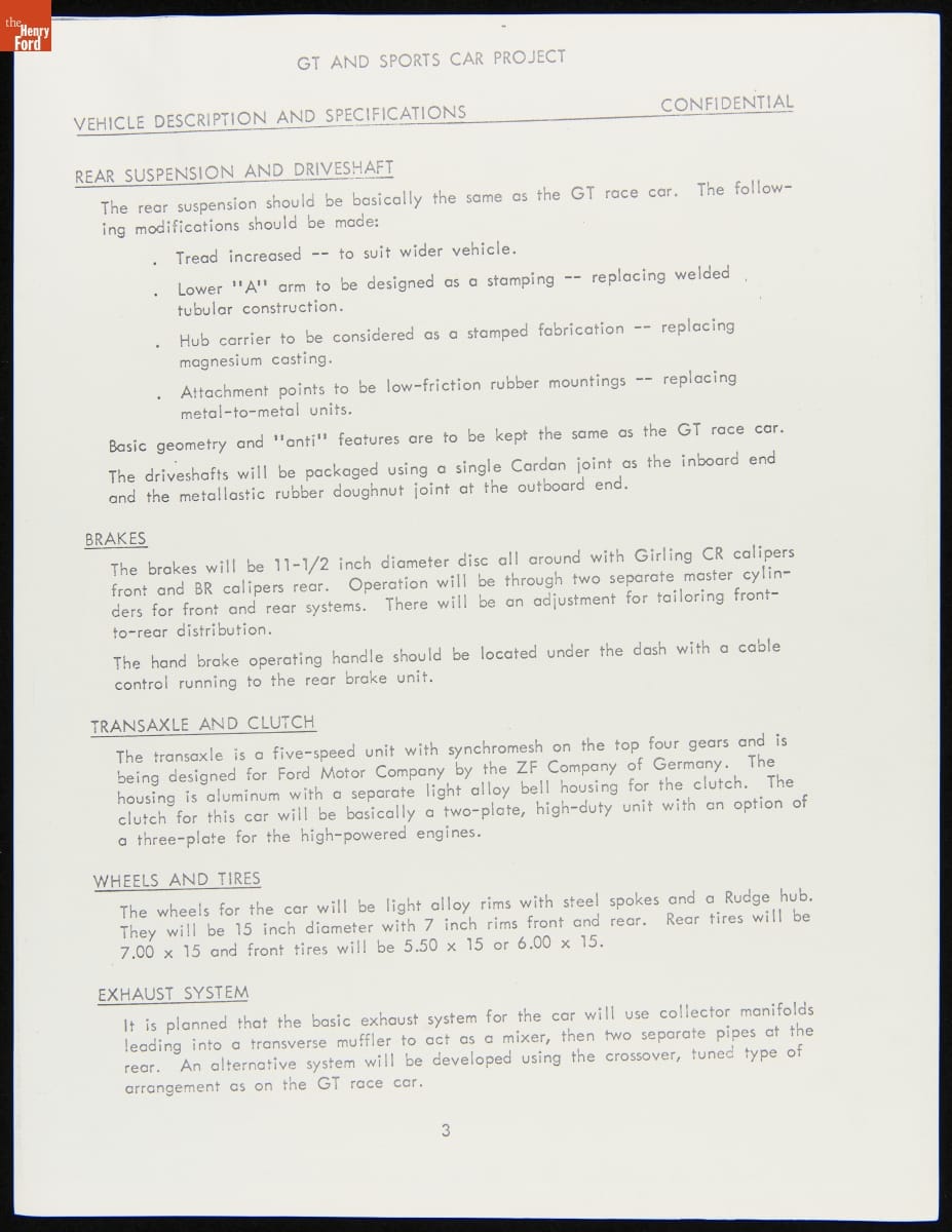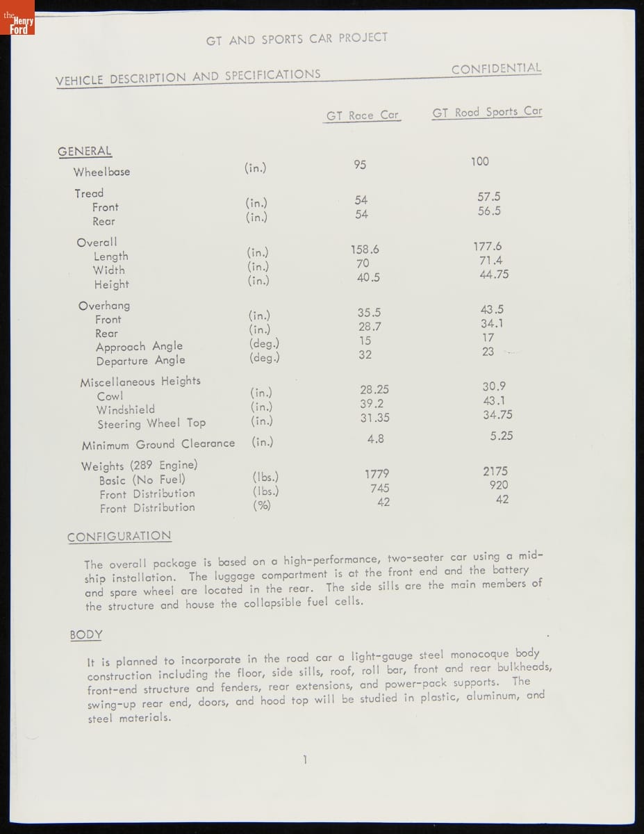 In the mid-1960s, Ford Motor Company designed and built a new GT car for endurance races like France's 24 Hours of Le Mans. It was part of a larger effort to give the company a sportier image and attract younger customers. This memo described specifications and performance characteristics for a proposed two-seat, mid-engine car.
