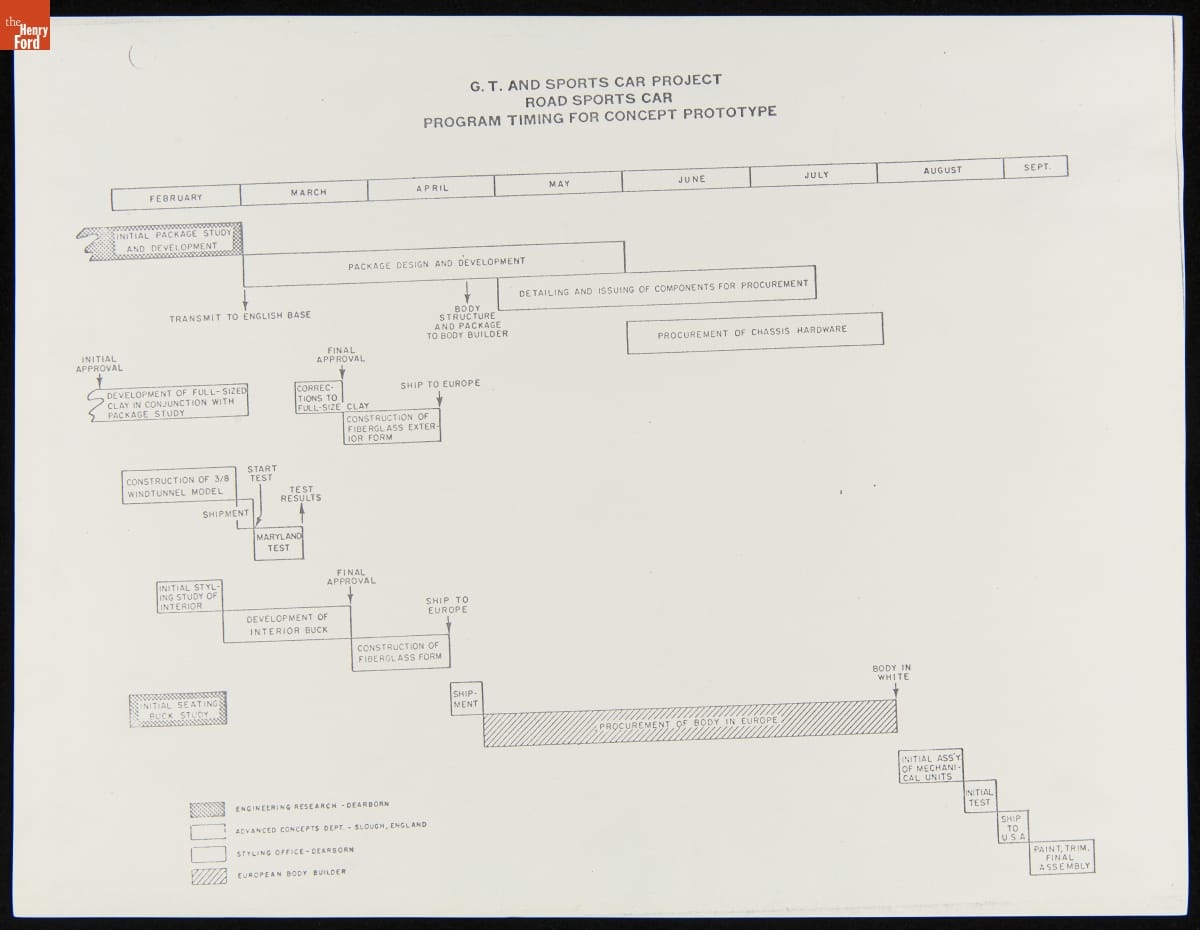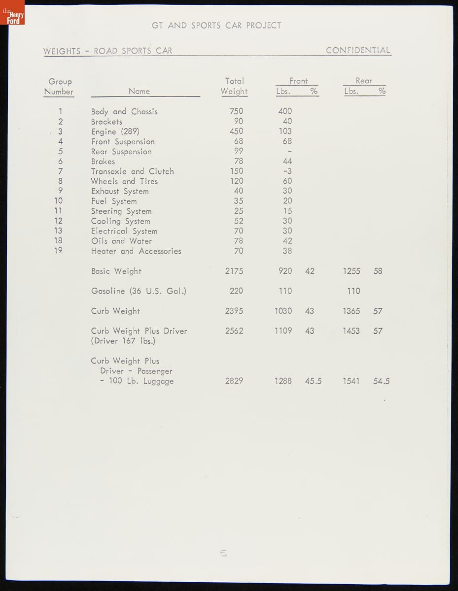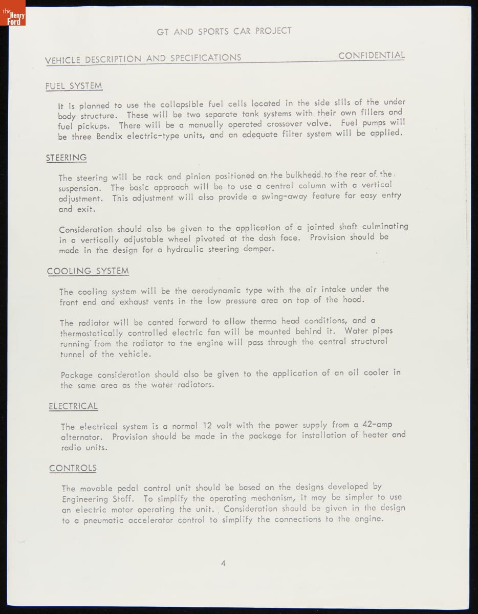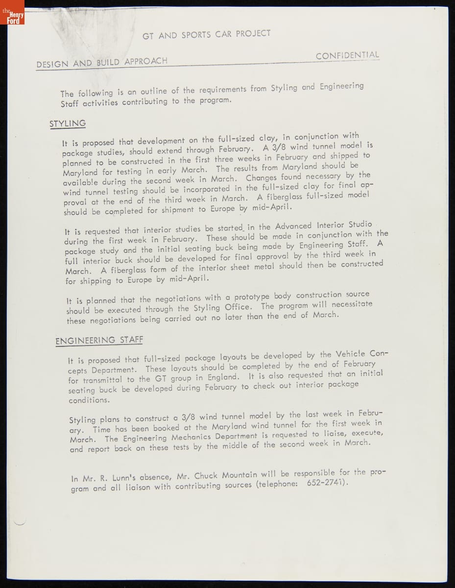 In the mid-1960s, Ford Motor Company designed and built a new GT car for endurance races like France's 24 Hours of Le Mans. It was part of a larger effort to give the company a sportier image and attract younger customers. This memo described specifications and performance characteristics for a proposed two-seat, mid-engine car.