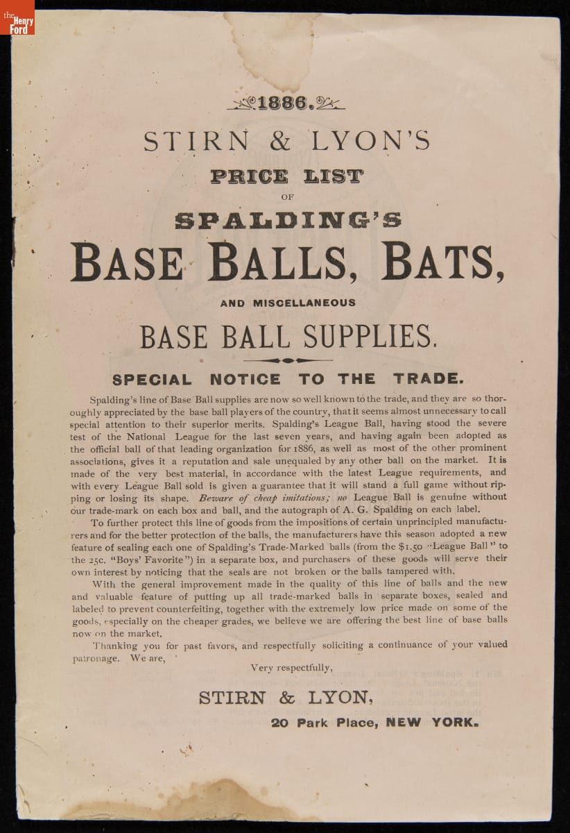 Stirn & Lyon's Price List of Spalding's Base Balls, Bats, and Miscellaneous Base Ball Supplies, 1886