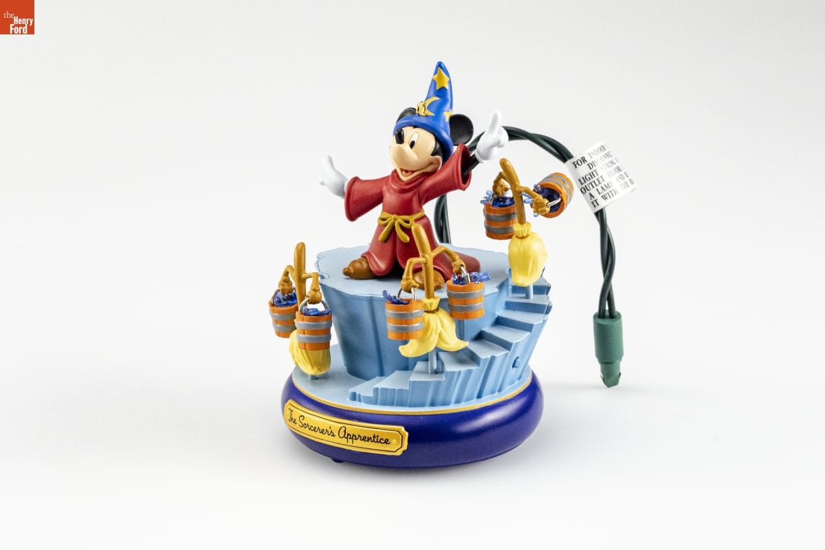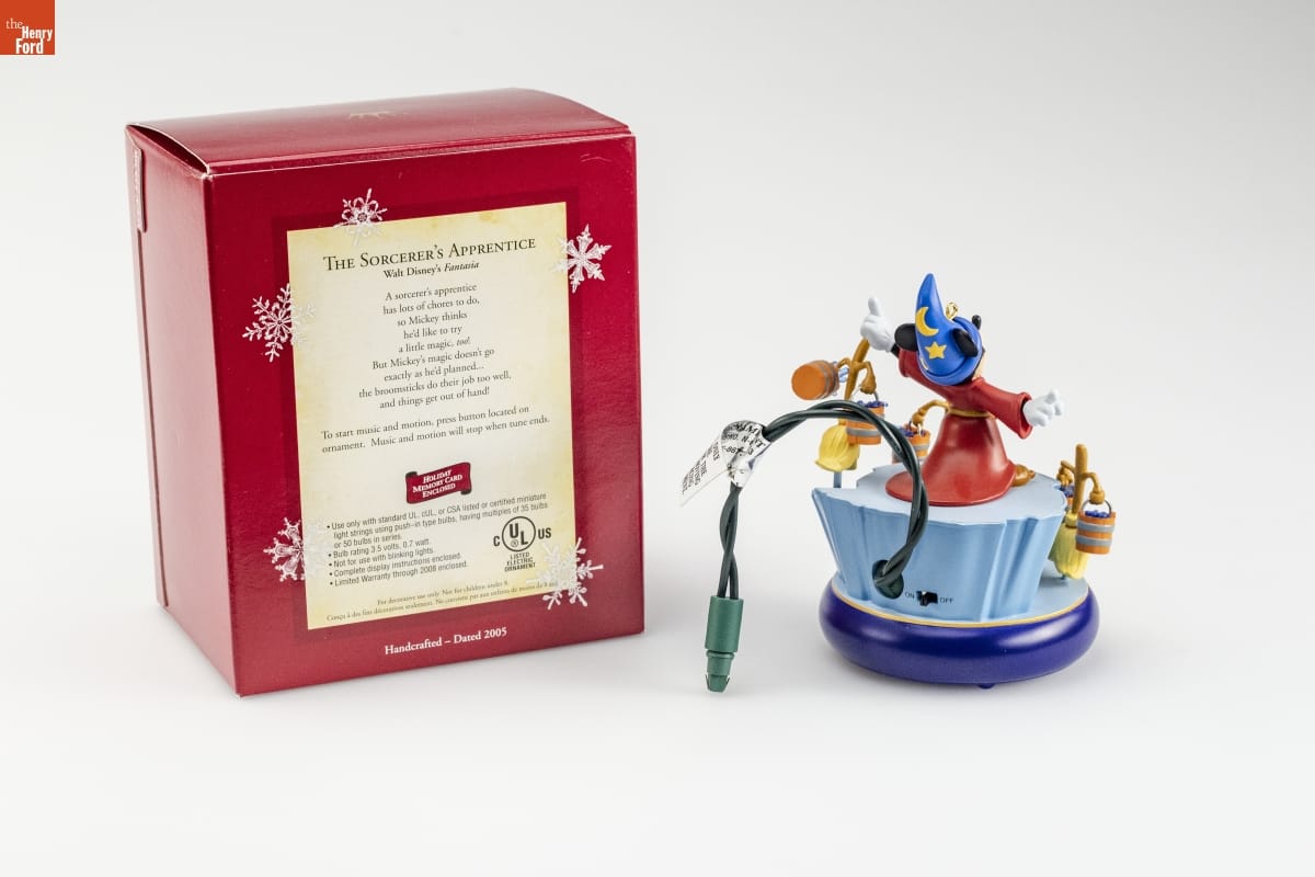 THE SORCERER'S APPRENTICE / Walt Disney's Fantasia / A sorcerer's apprentice / has lots of chores to do, / so Mickey thinks / he'd like to try / a little magic, too! / But Mickey's magic doesn't go / exactly as he'd planned... / the broomsticks do their job too well, / and things get out of hand! / To start music and motion, press button located on / ornament. Music and motion will stop when tune ends./ HOLIDAY / MEMORY CARD / ENCLOSED / Use only with standard UL, cUL, or CSA listed or certified miniature / light strings using push-in type bulbs, having multiples of 35 bulbs / or 50 bulbs in series. / Bulb rating 3.5 volts, 0.7 watts. / Not for use with blinking lights. / Complete display instructions enclosed. / Limited Warranty through 2008 enclosed. / C UL (R) US / LISTED / ELECTRIC / ORNAMENT / For decorative use only. Not for children under 8. / Concu a des fins decoratives seulement. / Ne convient pas aux enfants de moins de 8 ans. / Handcrafted - Dated 2005