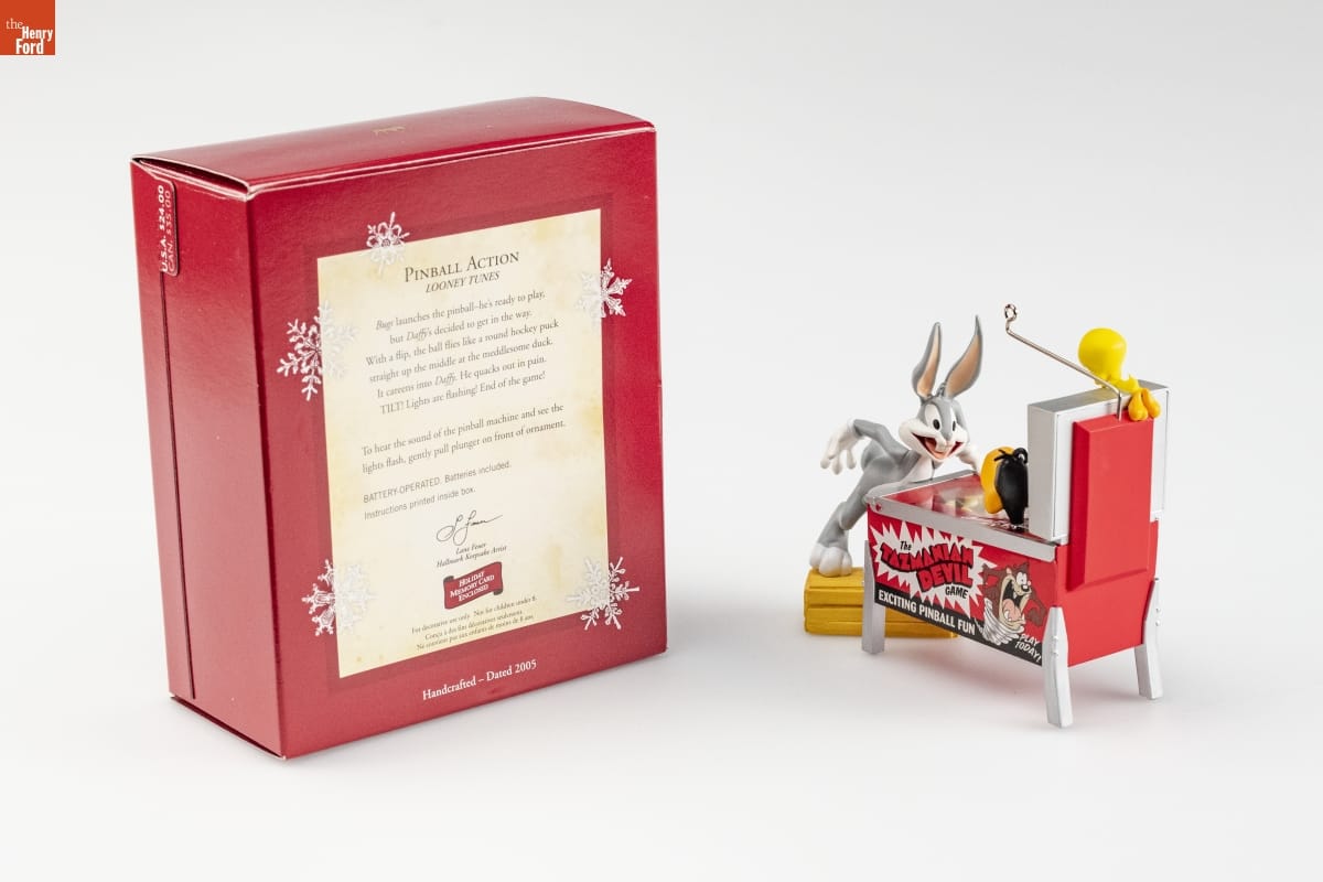 PINBALL ACTION / LOONEY TUNES / Bugs launches the pinball-he's ready to play, / but Daffy's decided to get in the way. / With a flip, the ball flies like a round hockey puck / straight up the middle at the meddlesome duck. / It careens into Daffy. He quacks out in pain. / TILT! Lights are flashing! End of the game! / To hear the sound of the pinball machine and see the / lights flash, gently pull plunger on front of ornament. / BATTERY-OPERATED. Batteries included. / Instructions printed inside box. / Lane Feuer / Hallmark Keepsake Artist / HOLIDAY / MEMORY CARD / ENCLOSED / For decorative use only. Not for children under 8. / Concu a des fins decoratives seulement. / Ne convient pas aux enfants de moins de 8 ans. / Handcrafted - Dated 2005